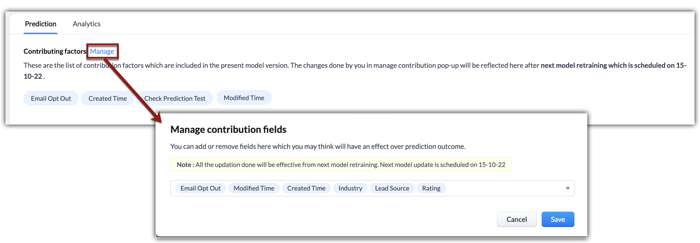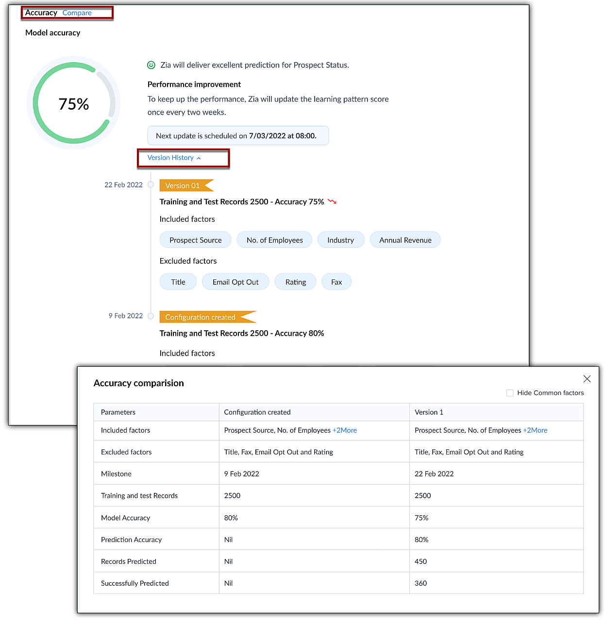 Ziaの学習は、継続的に行われます。予測モデルが構築されると、Ziaは15日ごとに再学習、再調整し、各モデルはバージョンとしてログに記録されます。バージョン履歴では、データセットがどのように改良してきたのかを知るために、元のモデルに対して最大4つのバージョンを表示することができるようになりました。バージョン番号、該当バージョンの学習の寄与要因、日付が表示されます。