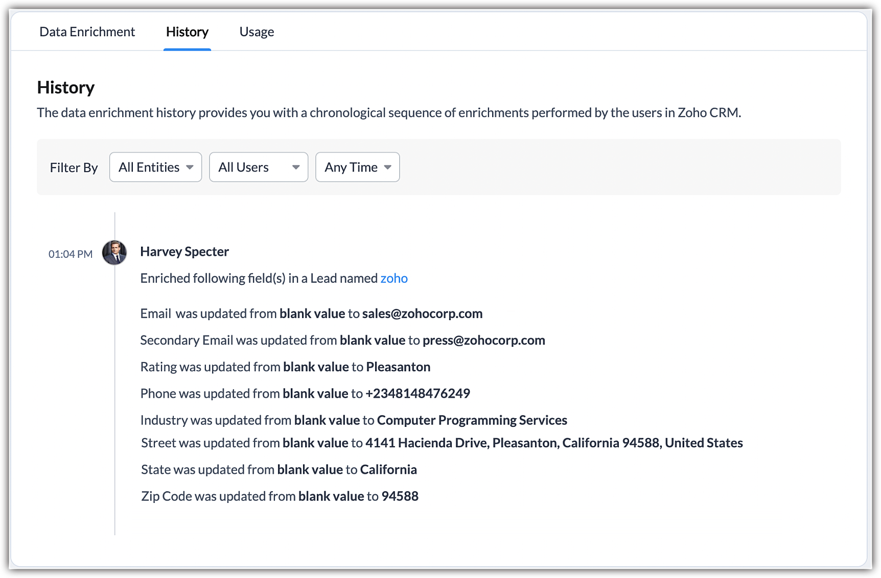 データエンリッチメントの履歴は、組織内で行われたすべてのエンリッチメント活動のログです。ユーザー名、データ名、データエンリッチメントの日時、データの更新内容が時系列で一覧化されます。CRMの監査ログと同様に、タブ名、ユーザー名、時間などの異なる条件に基づいて履歴をフィルタリングすることもできます。