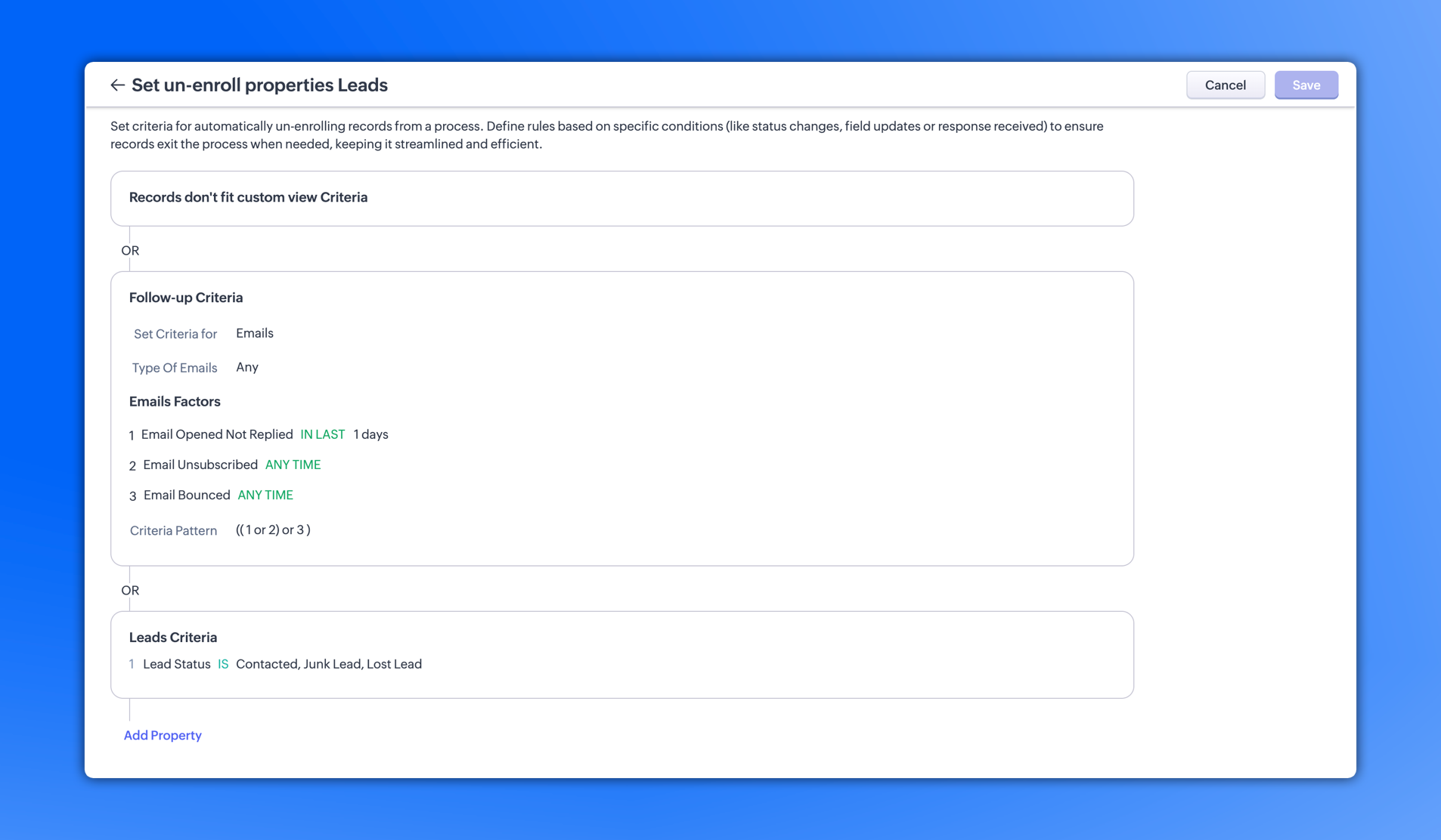 たとえば、セールスのケイデンスにおいて、見込み客のステータスが連絡済み/無効/失注の場合、または顧客がメールを開封したが1日以上返信がない場合、またはメールが不達になった場合や、メールの登録を解除された場合に、自動的にケイデンスの適用を解除することができます。