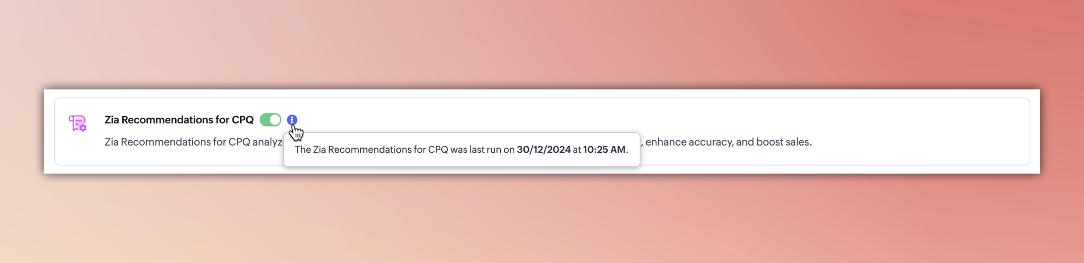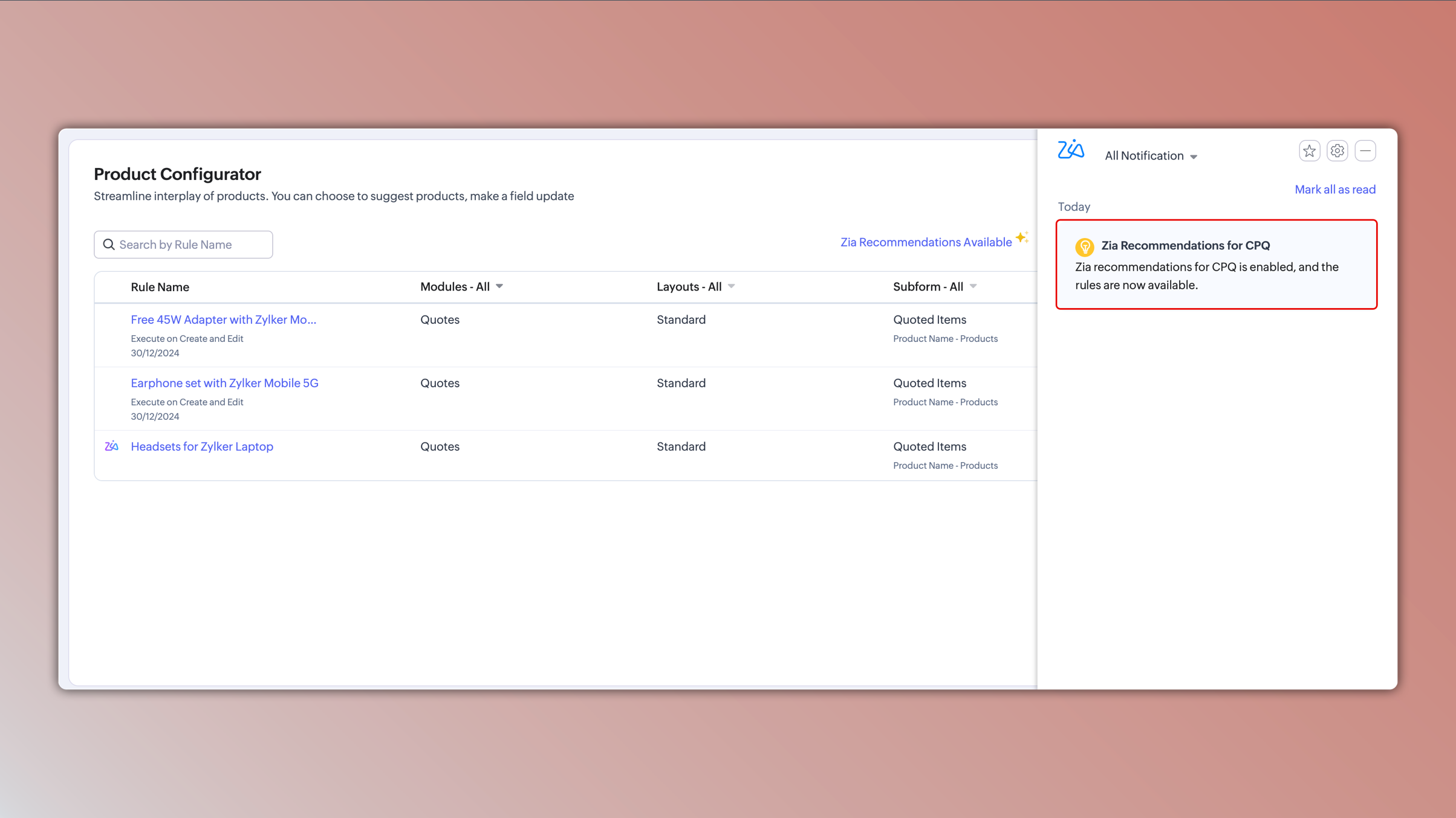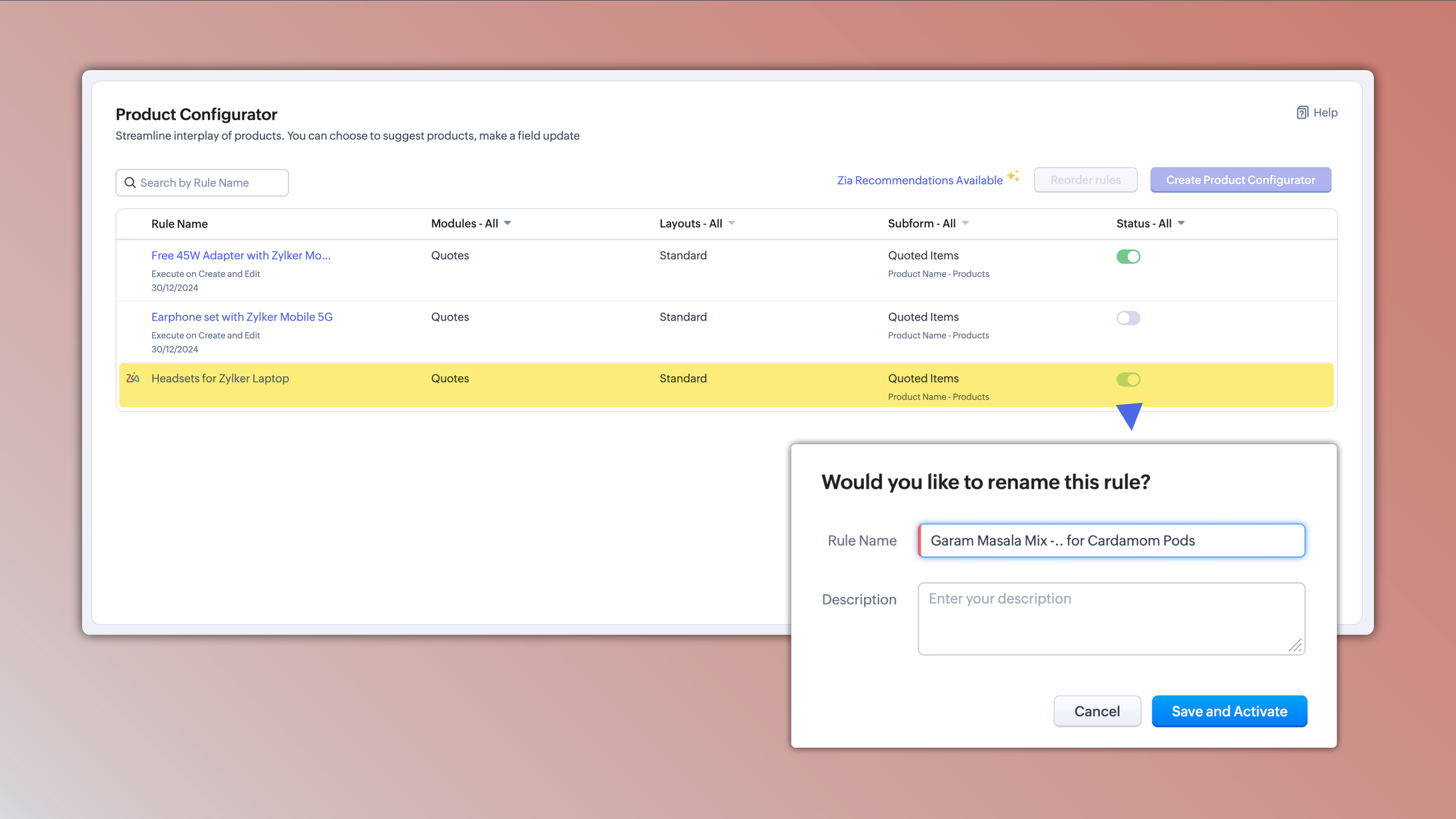 最新の機能強化により、Ziaは過去の販売データを分析し、最も頻繁に使用される商品の組み合わせを特定することで、このプロセスを自動化します。新しい商品ルールを手動で設定する代わりに、Ziaは見積パターンに基づいて最適な商品設定を提案します。これにより、企業は変化する販売トレンドに効率的に適応できるようになります。