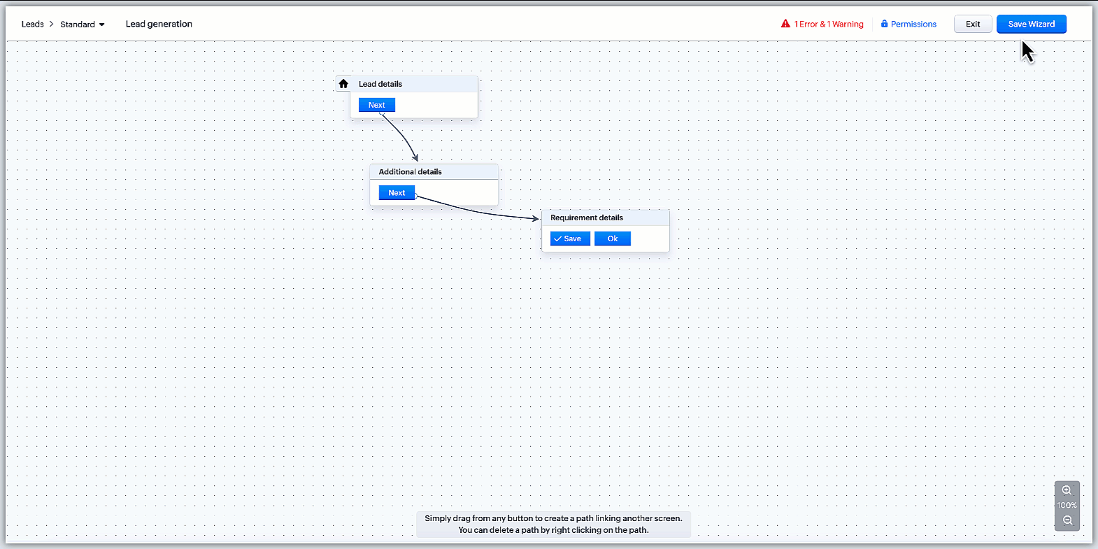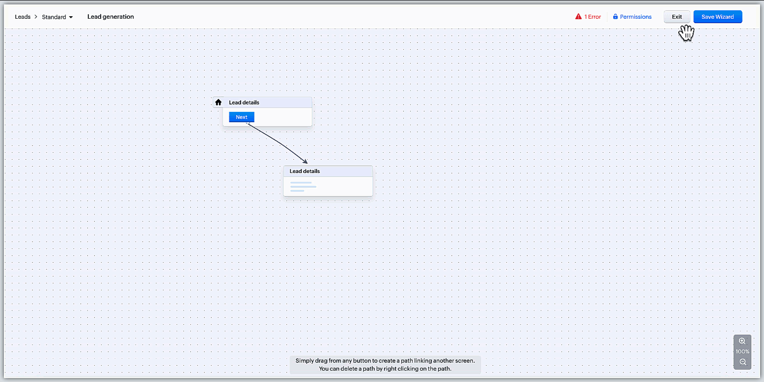 以前は、ウィザードの主経路に接続されていない画面は、ウィザードの機能に問題を引き起こす可能性がありました。現在では、これらの「孤立した画面」(他のどの画面にも関連付けられていない画面)が検出されると、警告メッセージが表示され、削除するか、ウィザードの他の画面に接続することで解決できます。ただし、この警告メッセージに対する対応を完了しなくても、ウィザードの保存は可能です。