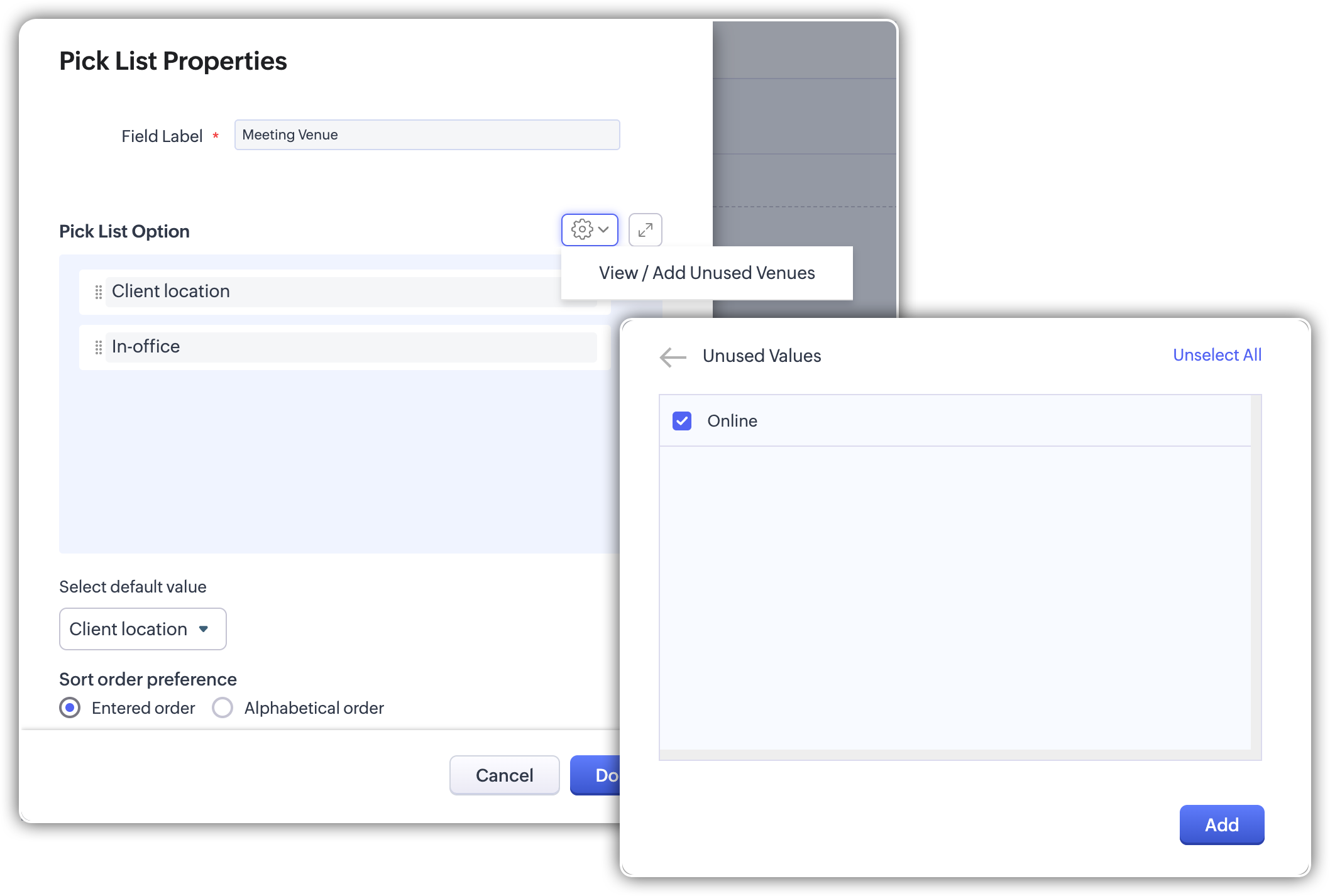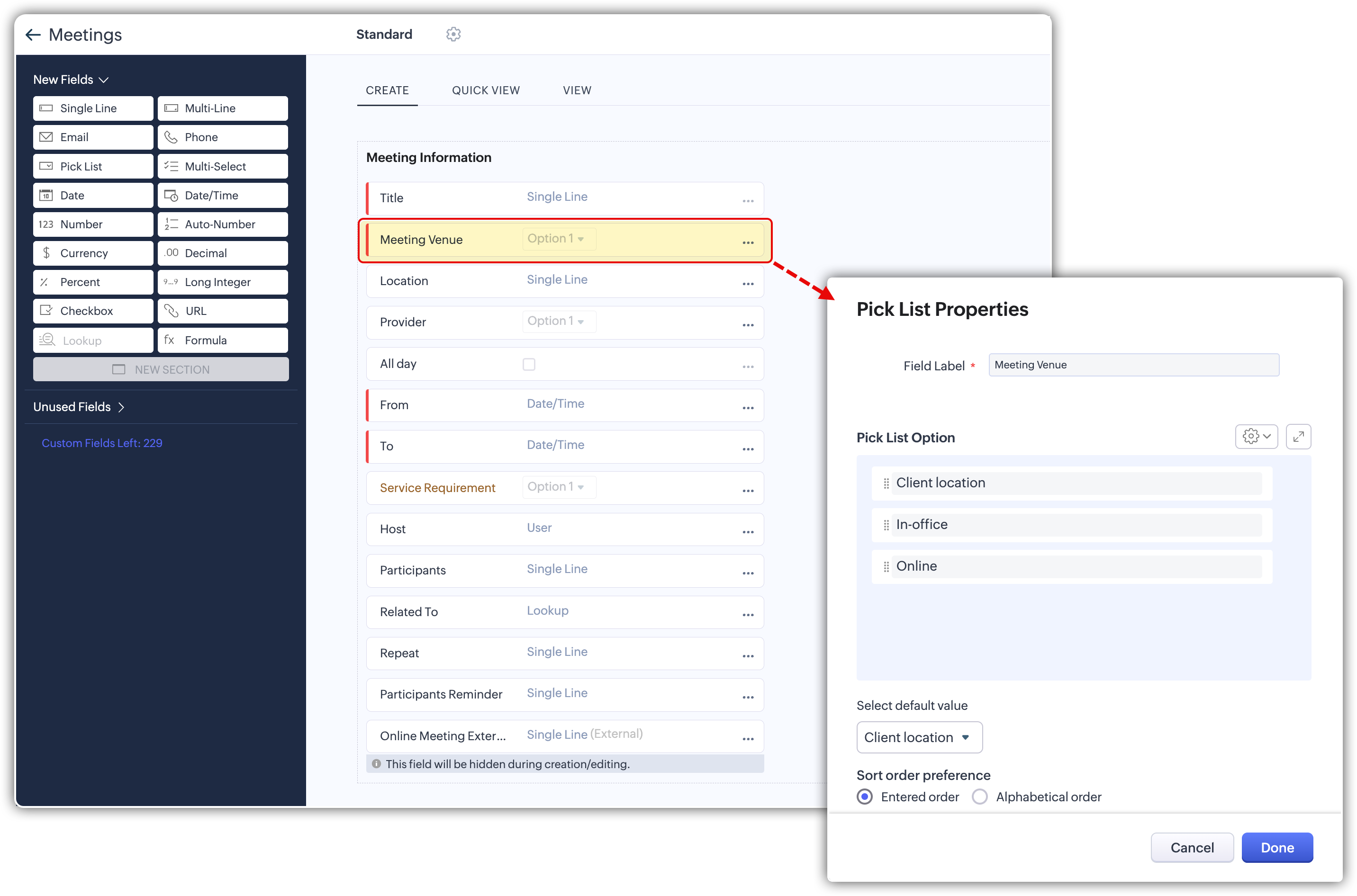 同様に、対面の予定のオプションが不要な場合は、顧客のオフィスまたは対面のオプションを削除でき、場所項目も削除されます。