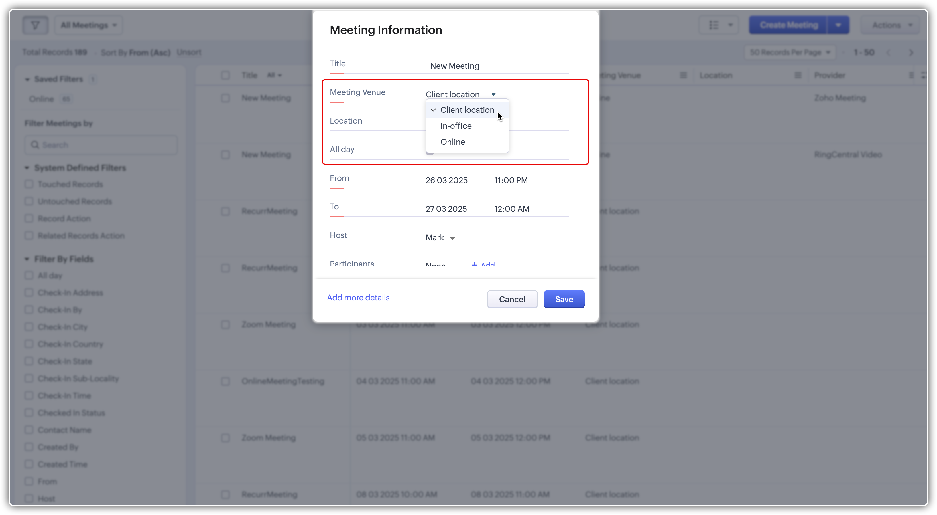 【Zoho CRM】予定タブに関するアップデートのお知らせ:予定の場所項目を使用して、予定を「オンライン」「顧客のオフィス」「対面(オフィス内)」に分類できるようになりました。