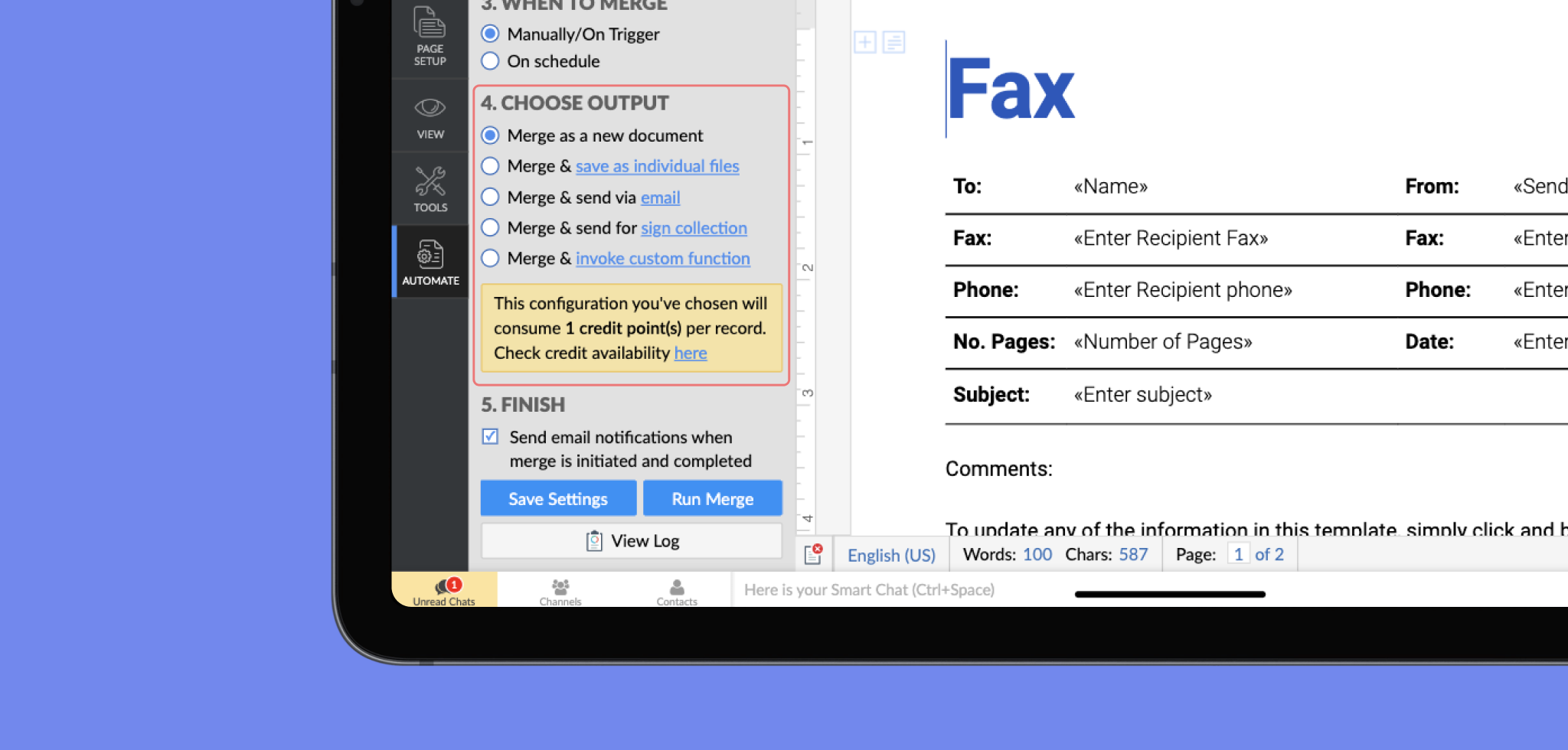 また、MS Office 用プラグインがあれば、 MS Word のテンプレートをインポートして、お使いのデバイスで差し込み文書テンプレートを簡単に作成することができます。
