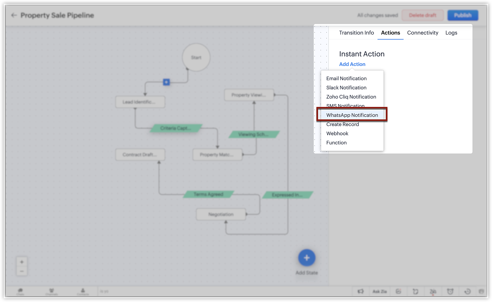 ブループリントの遷移では、遷移後の処理として WhatsApp通知を設定できます。WhatsApp 通知オプションは状態の設定内にある処理でも設定できます。