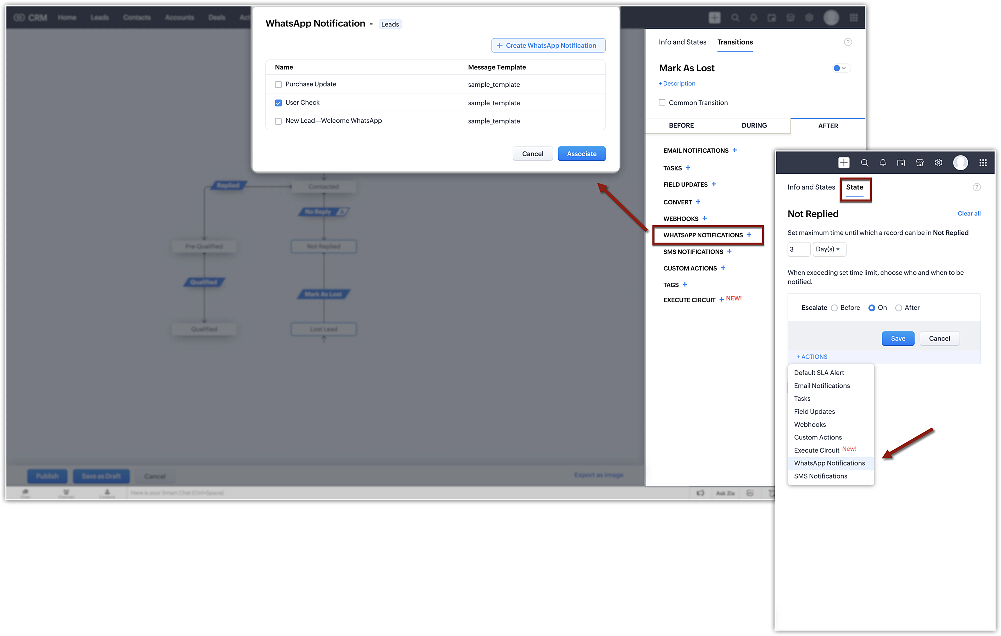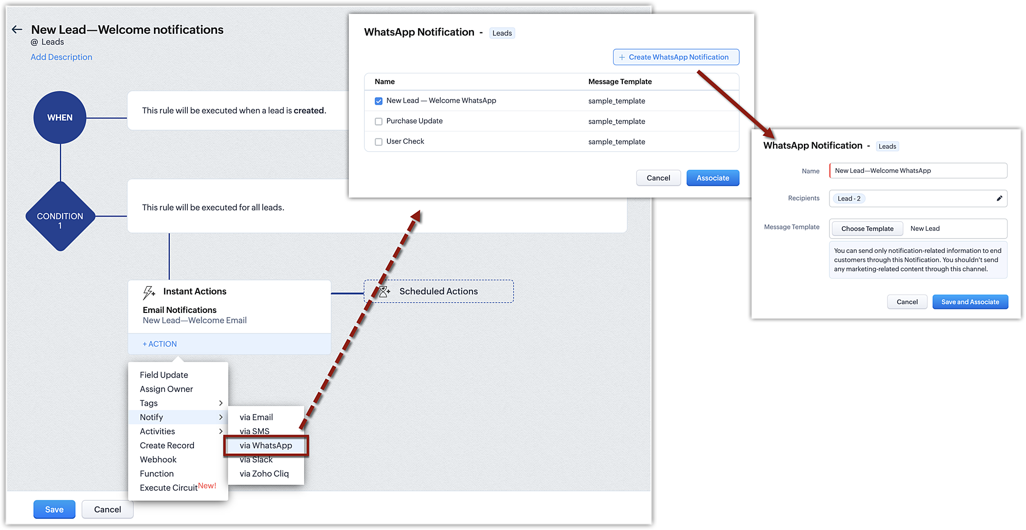WhatsAppのメッセージテンプレートを設定し、Facebookに承認されると、そのテンプレートを使用して通知を作成できるようになります。この通知は、以下のような自動化機能と関連付けることができます。