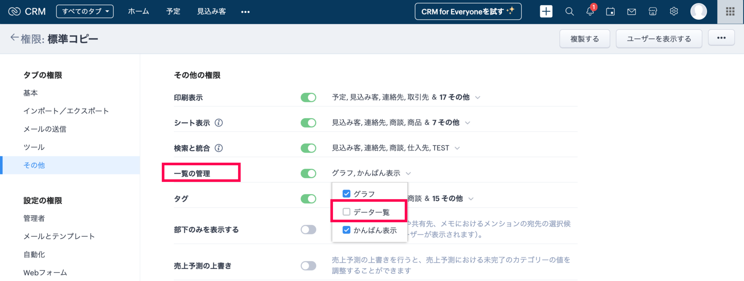 【Zoho CRM】タブ内データ一覧の表示項目を編集する権限について