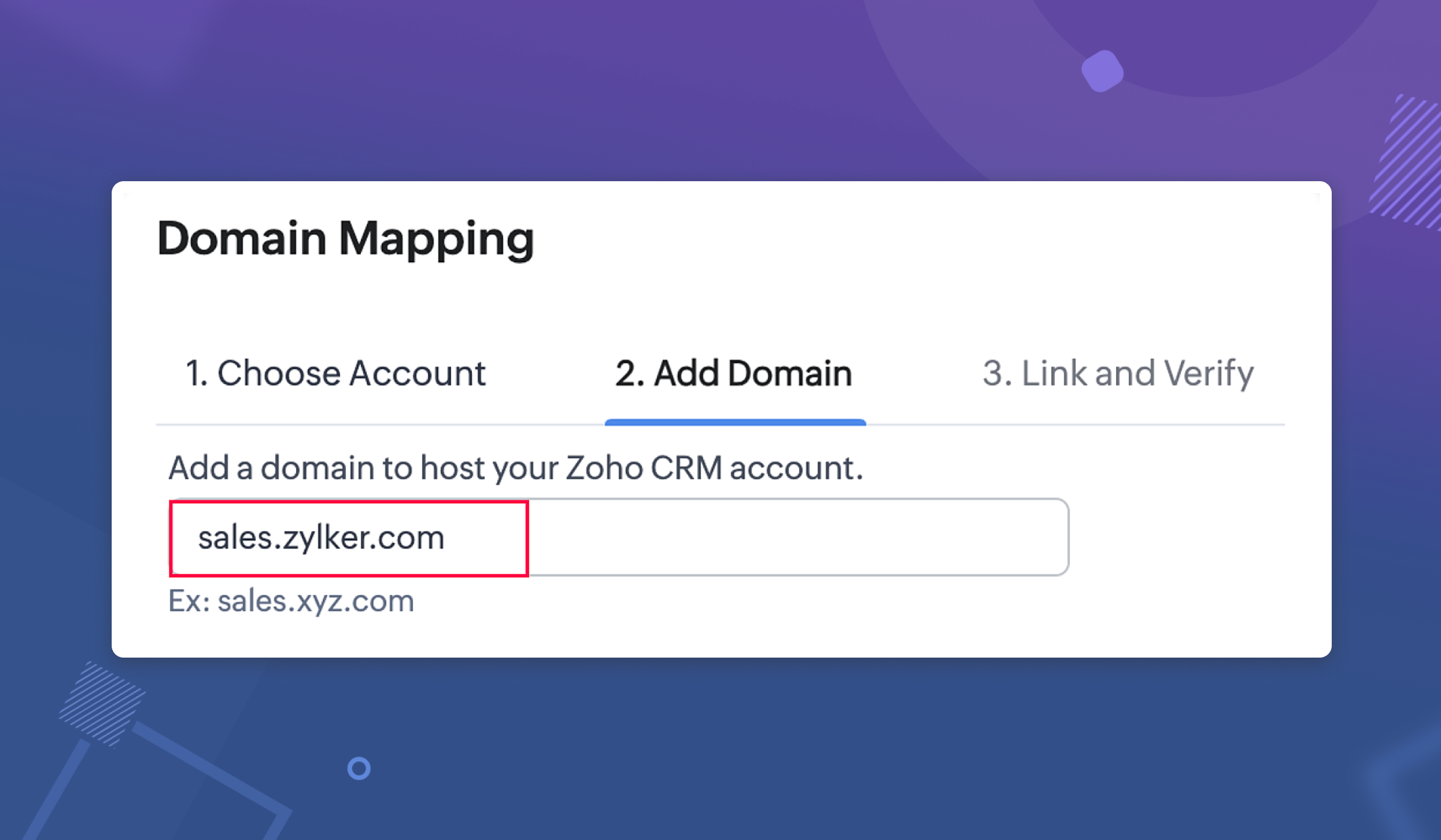 Zoho CRMのドメインの追加画面で、ドメインのURLを指定します。URLは、「<サブドメイン>.<ドメイン>.com」の形式で指定する必要があります。