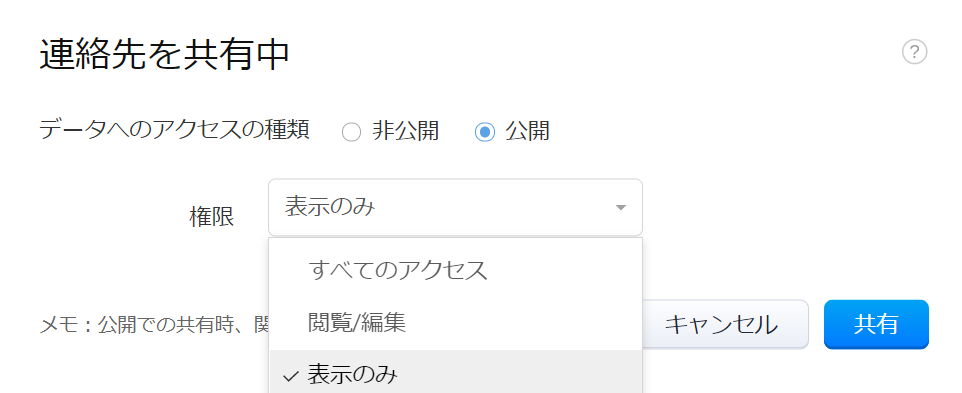 現在は「公開」のアクセスとして、組織内すべてのユーザーにデータを共有(表示のみ 、閲覧/編集、すべてのアクセス)できるようになりました。