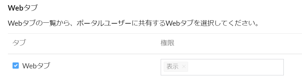 ポータルの設定画面の「ポータルで使用するタブの設定」にて、ポータルユーザーに表示したいWebタブを選択してください。