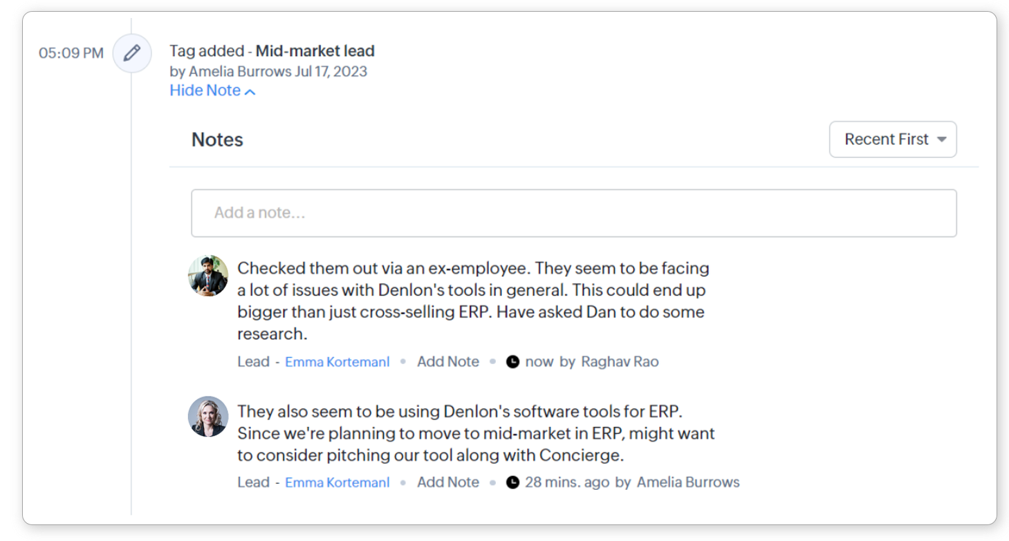 ほとんどのメモは、データに関連する活動に対応して追加されます。例えば、営業担当者は見込み客との通話の後にメモを追加したり、連絡先とのミーティングに関連したメモを作成するかもしれません。