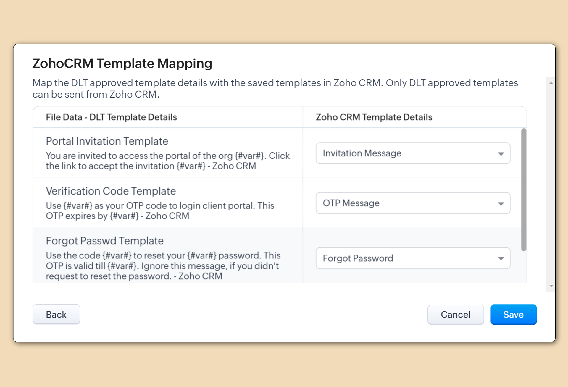 これらのテンプレートがインド電気通信規制庁(TRAI)によって承認されたら、DLT(分散型台帳技術)ファイルをCRMにアップロードし、CRMのテンプレートにマッピングしてください。テンプレートで使用するURLがホワイトリストに登録されていること確認してください。CRMの所属しているデータセンターに基づいて、以下のドメインのいずれかをホワイトリストに登録する必要があります: