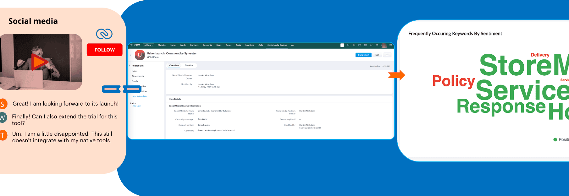鍵となるのはあなたのビジネスです。あなたのビジネスのプレゼンスをオンラインで確認し、それらのプラットフォームをZoho CRMと接続することで、フィードバックをデータとしてチャネリングし、最終的にこれらの目的のタブを、顧客の声のデータ元としてマッピングすることができます。