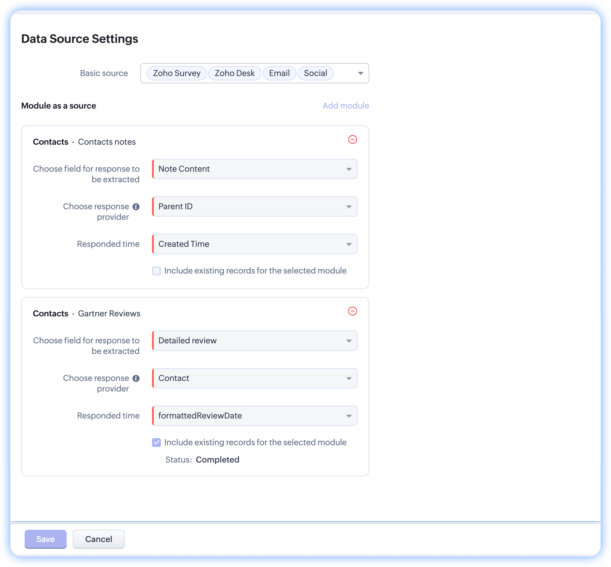 ご希望のデータ元からのフィードバックをZoho CRMのタブに保存したら、これらのタブを顧客の声分析のデータ元として追加します。