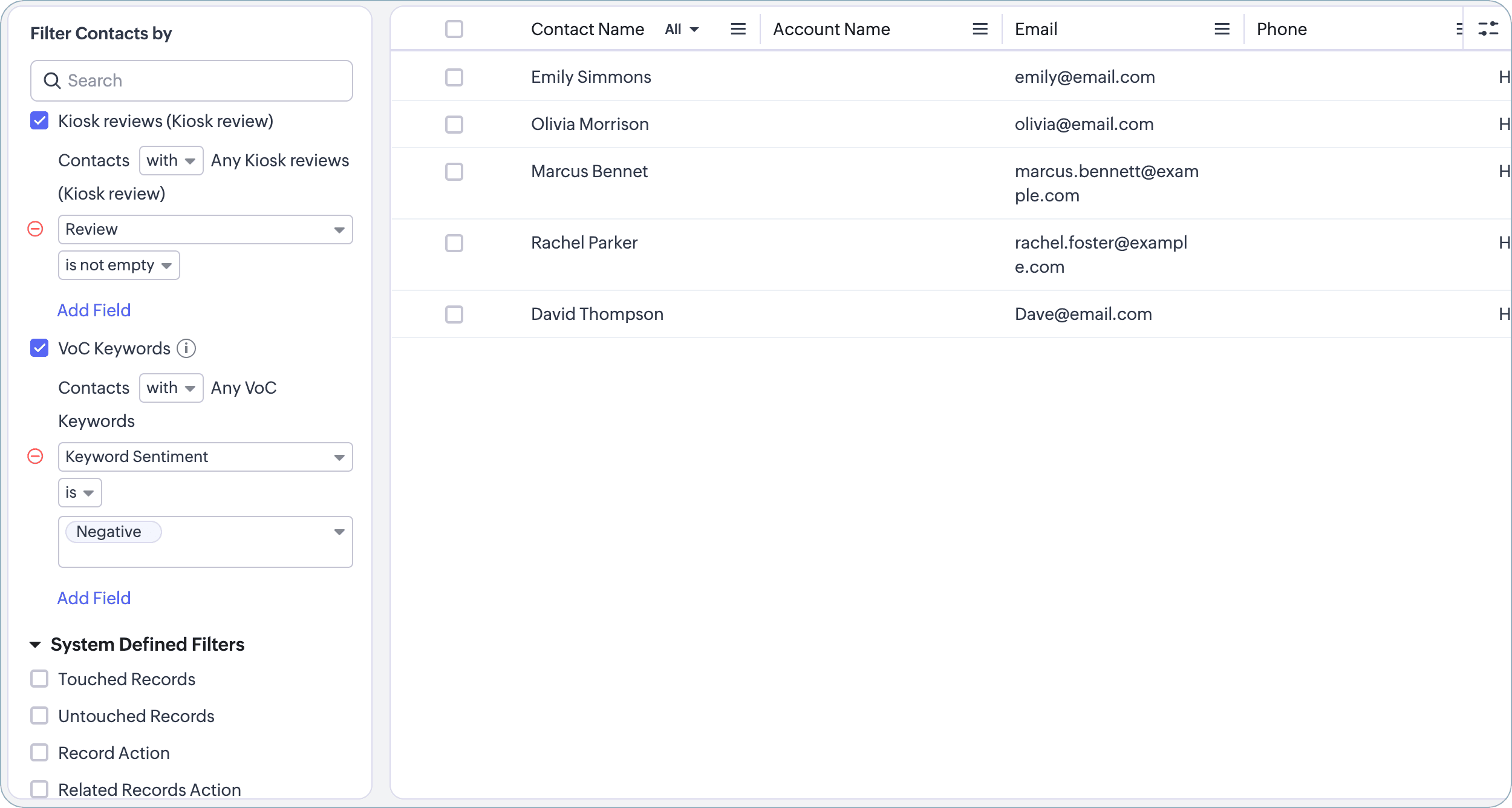 Zoho CRMのキオスクを使用すると、チェックアウト時に顧客のフィードバックを収集できます。キオスクの画面上にある項目を使用して、彼らの体験について尋ね、そのデータを専用のタブに保存するか、既存のタブにルーティングし、そのタブを顧客の声分析処理のデータ元として使用します。
