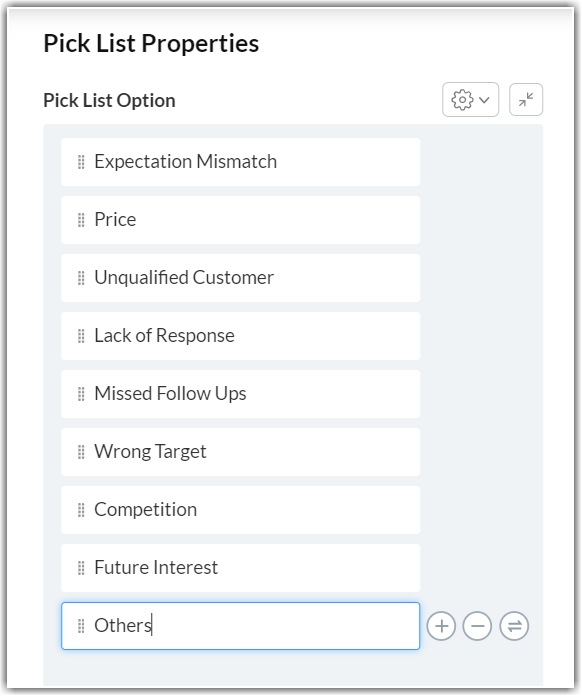 - すでに失注の理由を管理するために、カスタム選択リスト項目を作成している場合、この新機能は既存の項目に影響することはございません。新しい「失注の原因」項目が、「使用していない項目」セクションに存在することになります。