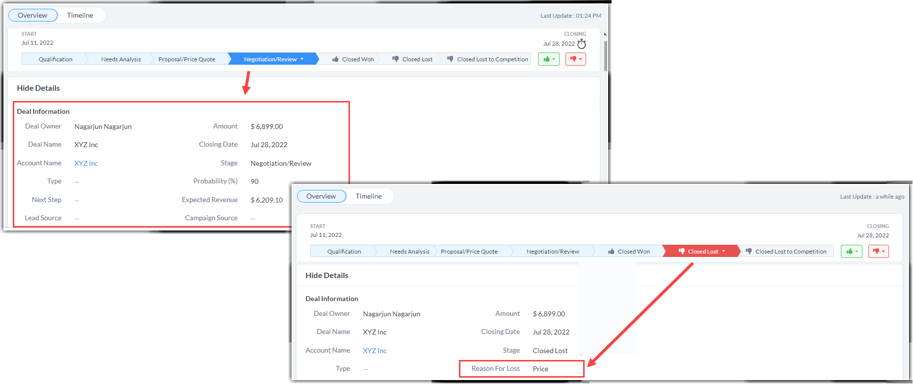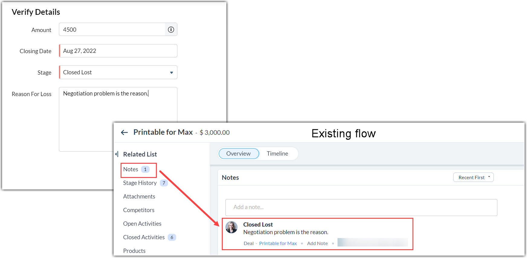 現在、Zoho CRMでは、商談が失注した場合、失注の原因を自由記入し、その詳細な原因をメモとして商談データに追加しています。