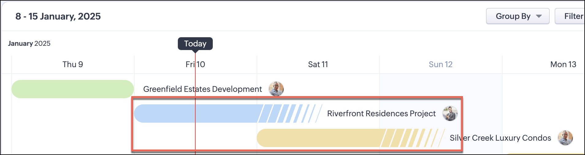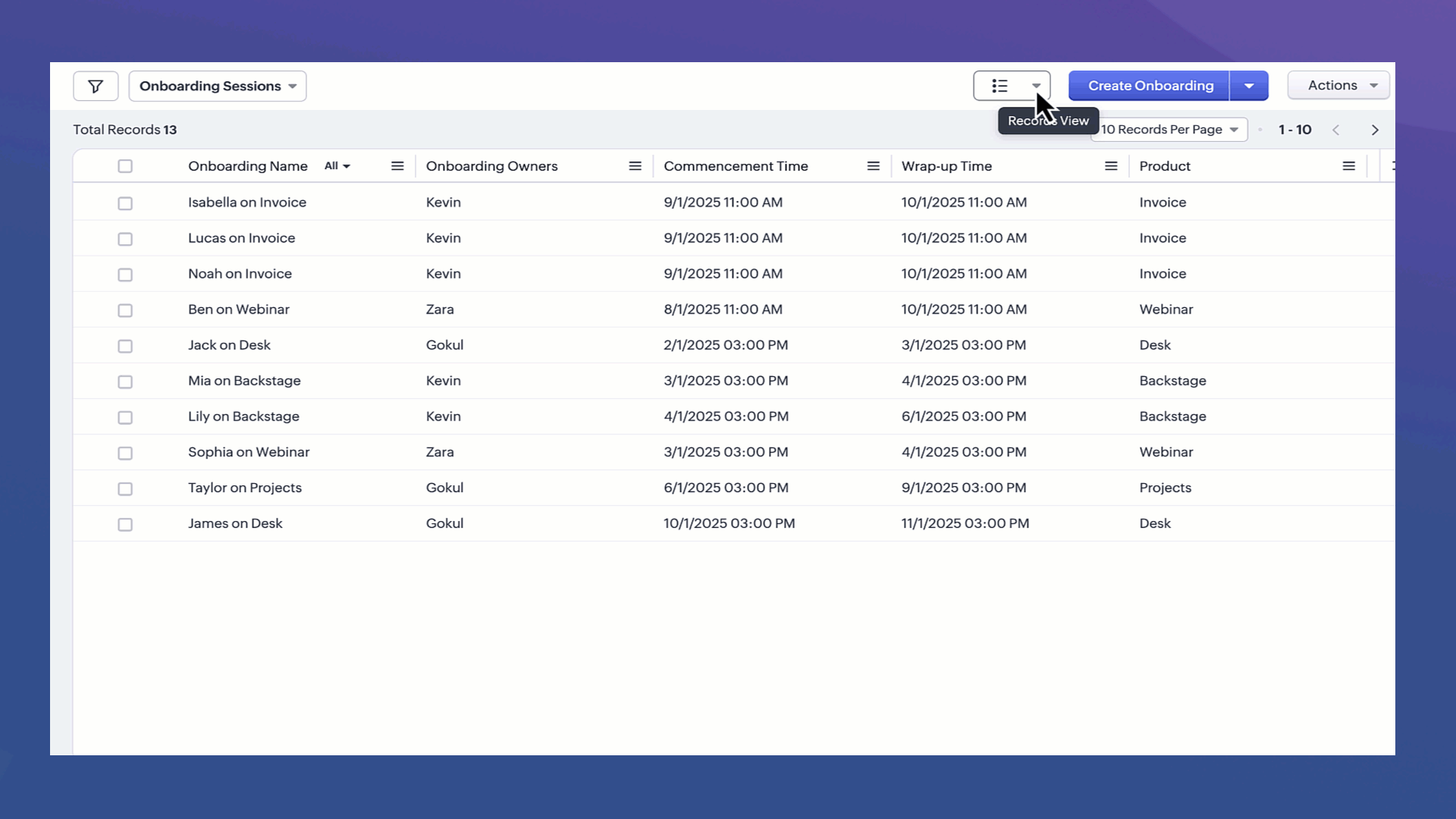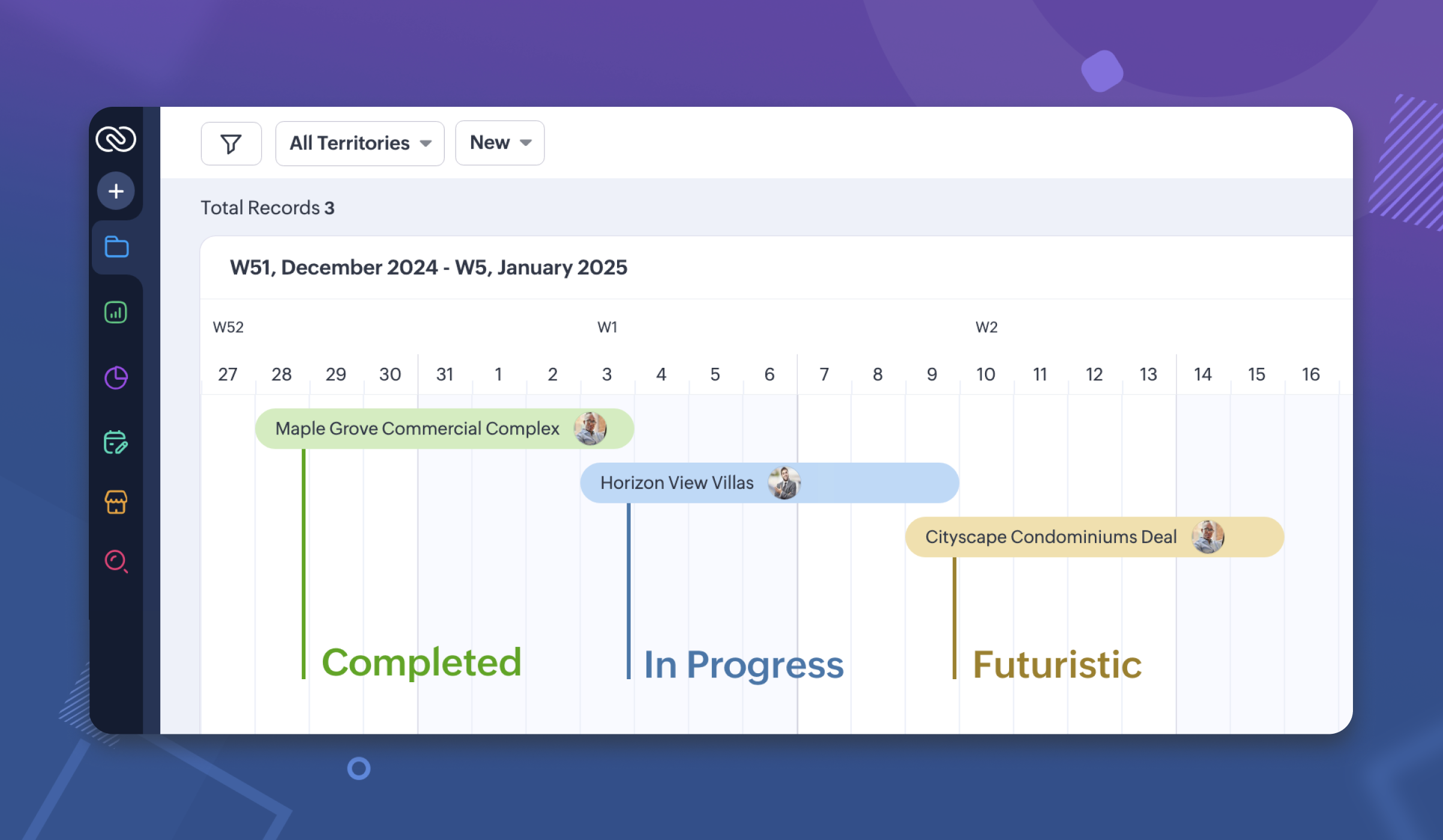 Zylker Propertiesのオペレーションマネージャーであるオリヴィアは、様々なプロジェクトやタスクを管理し、日々のワークフローの中で複雑な計画と実行を両立させています。整理された効率的な状態を維持するために、彼女はスケジュール表示を使用しています。スケジュール表示は、開始日と終了日に基づいて、日付に沿って視覚的にデータを配置する多目的ツールです。