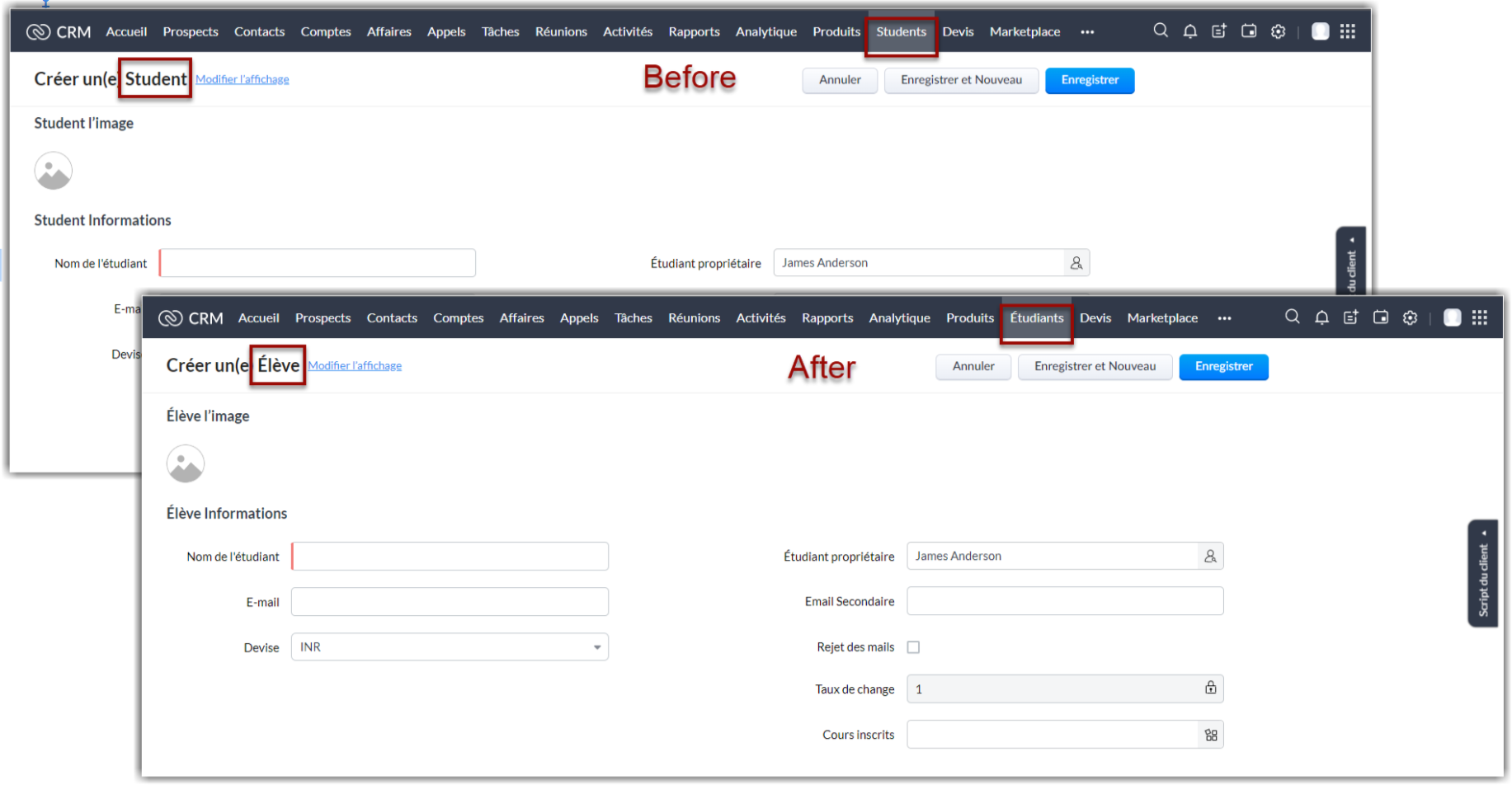 以下は、タブ名、サブフォーム名、関連リスト名のフランス語翻訳前後のスクリーンショットです。