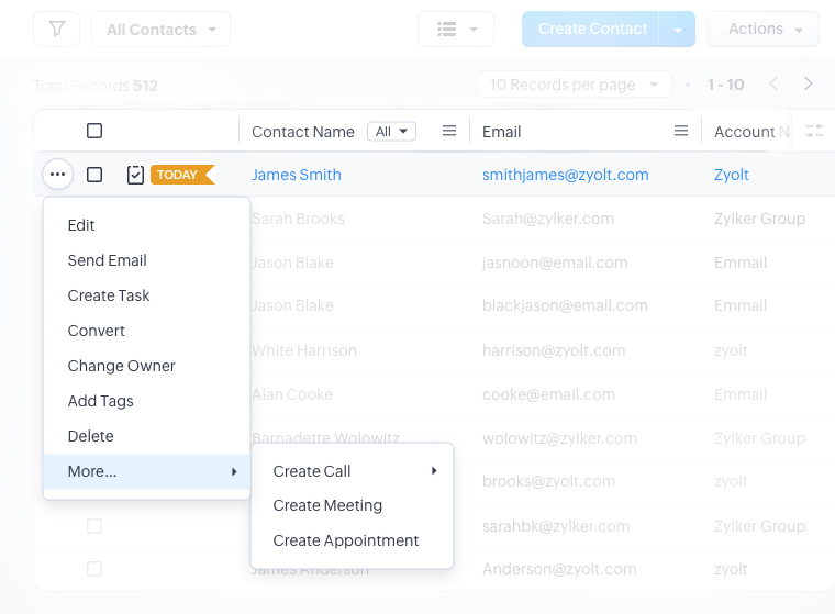 元来の標準的な一覧表示ビュー内で可能な処理に加え、各データに対する、その他の処理を追加しました。通話や予定の作成などの処理が含まれています。各データにカーソルを合わせ、表示される「・・・」をクリックすることで、各処理を行うことができます。