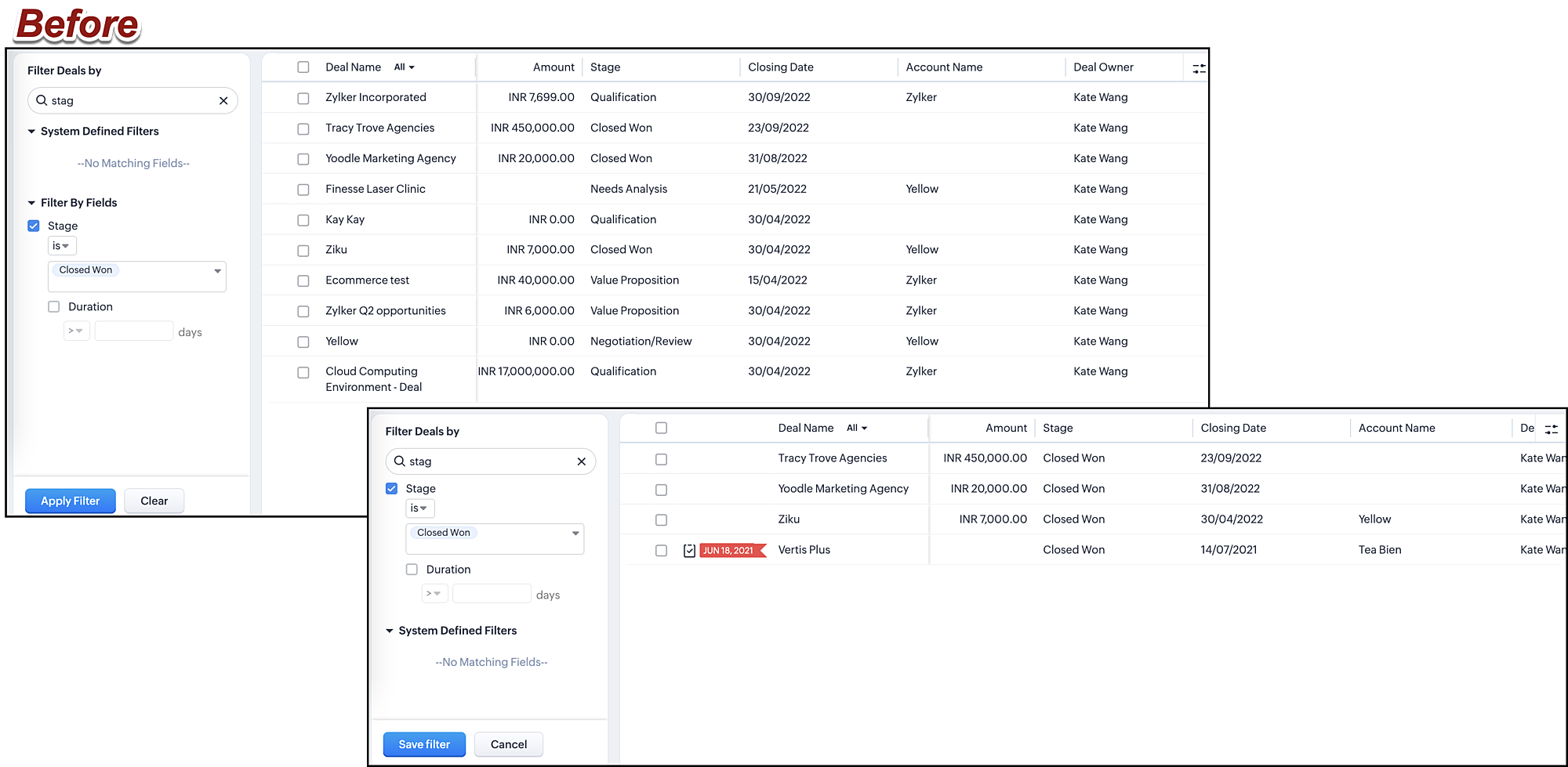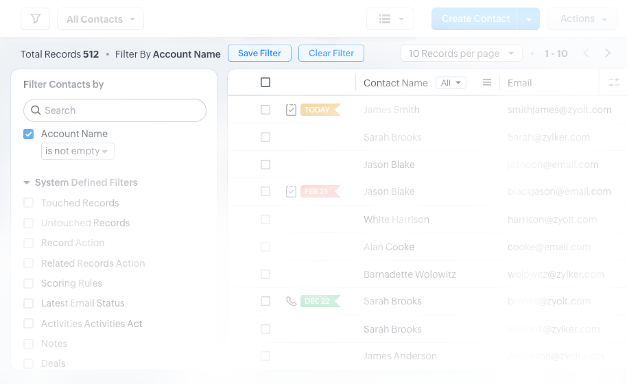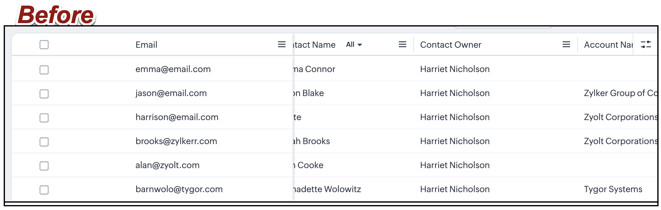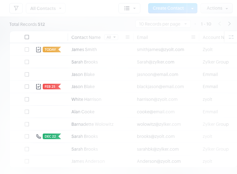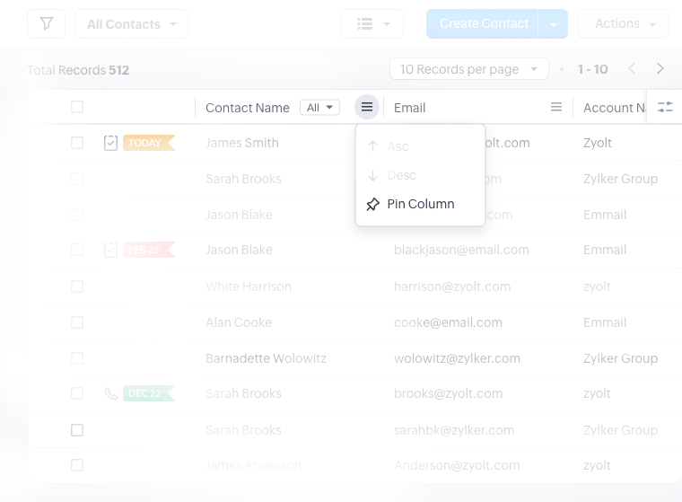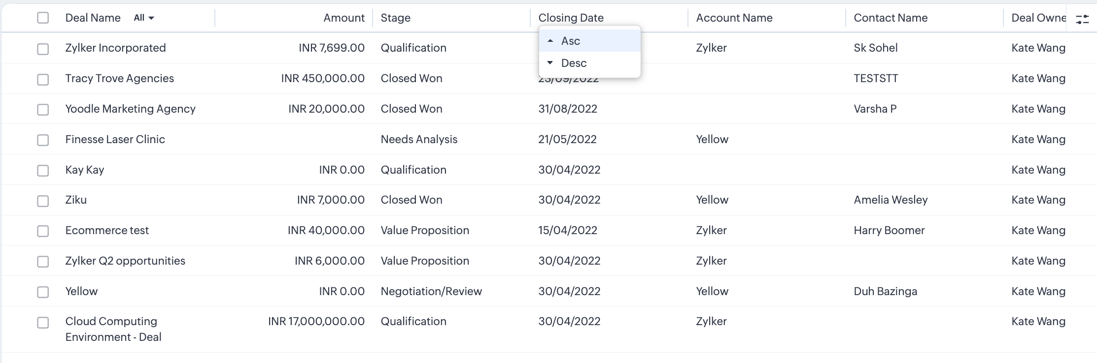 Zoho CRMの一覧表示ビューのUIにいくつかの更新がありました。ご存知の通り、一覧表示ビューはデータのシンプルな表です。データにアクセスしやすくするために、一覧表示ビューには、並び替えオプション、列の管理、フィルタリングなどのオプションが用意されています。
