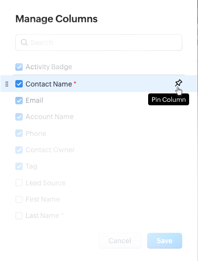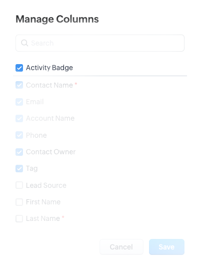 「活動バッジ」オプションは、「列の管理」ページで有効化/無効化できます。