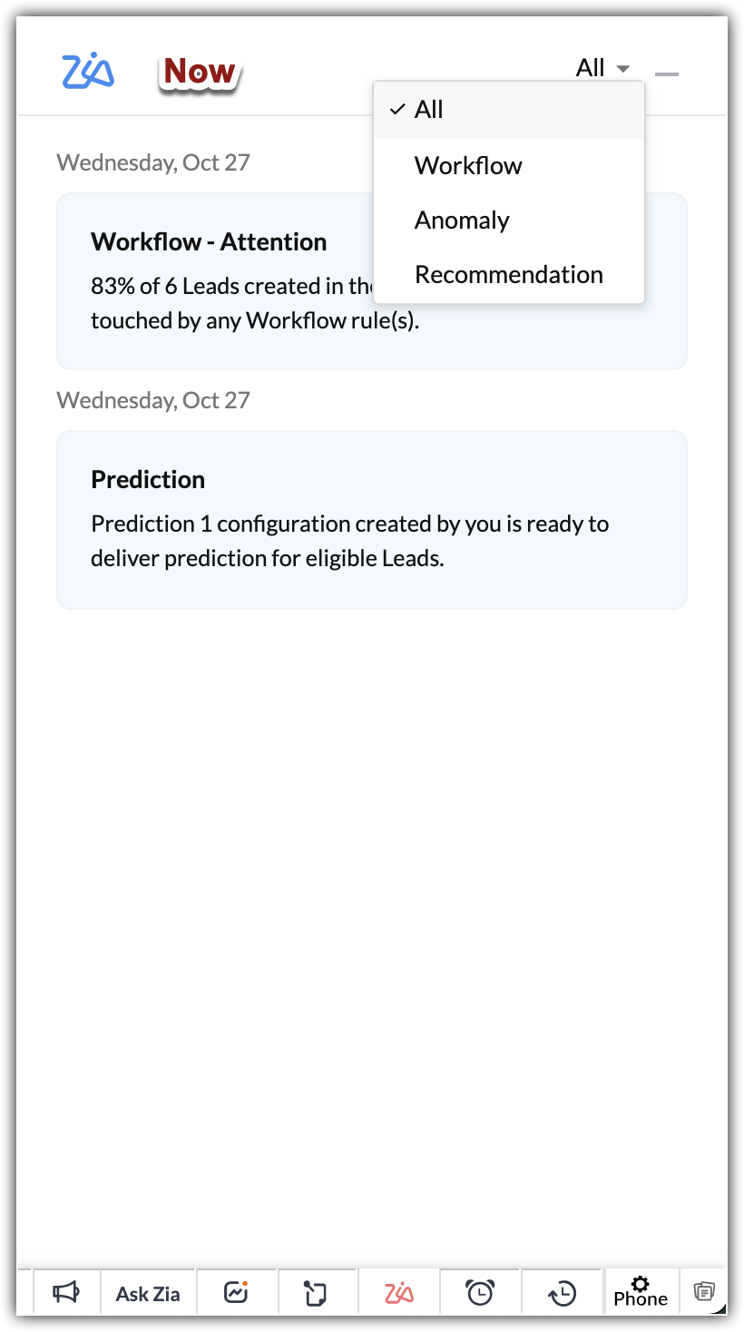 これまで、通知パネルには、ワークフロー、異常値の検出、レコメンデーション、予測、Zia VoiceでのZiaからの回答、競合他社アラートに関する通知やアラートが、発生した時点で表示されていました。