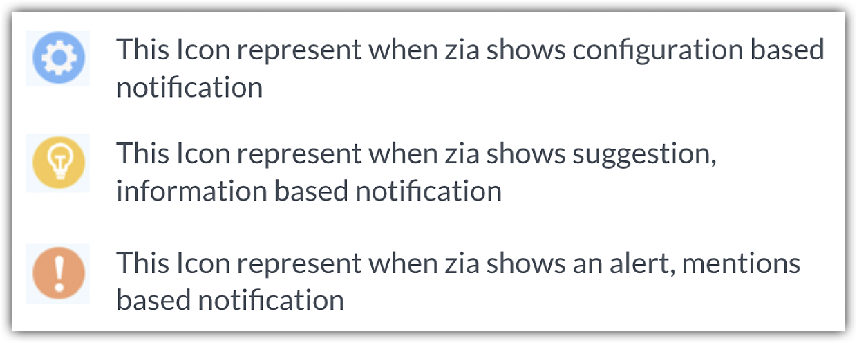 Zia通知は、設定やプロセス、提案や情報、異常、メンション、アラートなどのアクションに基づいて分類されます。これらのアクションに対し、それぞれのアイコンで表示され、簡単に解釈できるようになります。