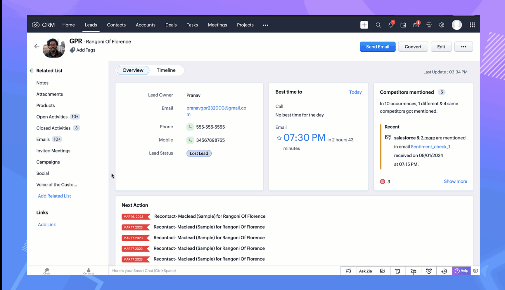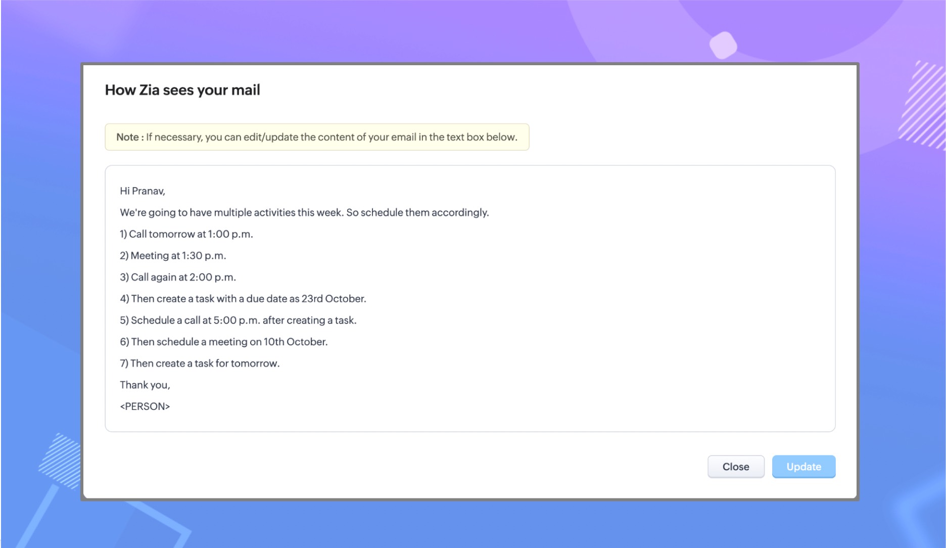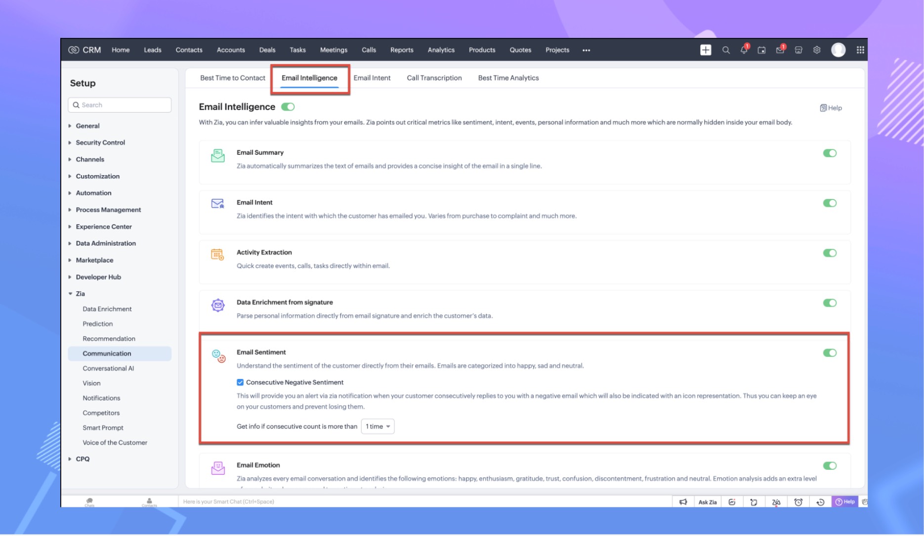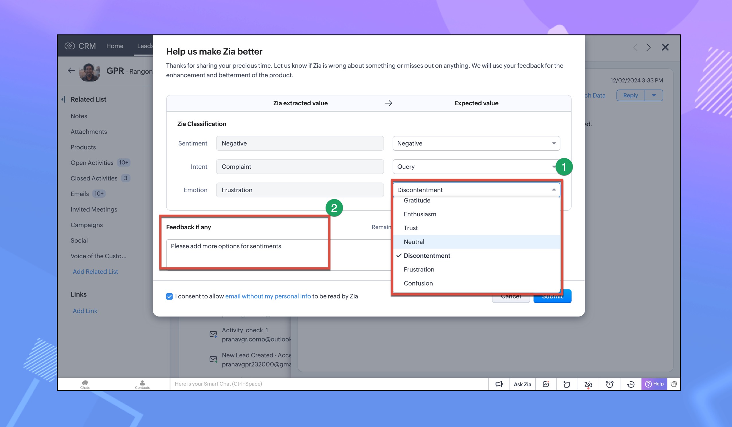 このような状況において、ユーザーからのフィードバックは、Ziaの機能を改善し、向上させるための重要な要素となっています。Ziaによる分析をユーザーの意見を元に検証することで、Zoho CRMのメールの分析を向上させ、情報に基づく、より効果的なビジネスコミュニケーション戦略を促進するのに役立ちます。