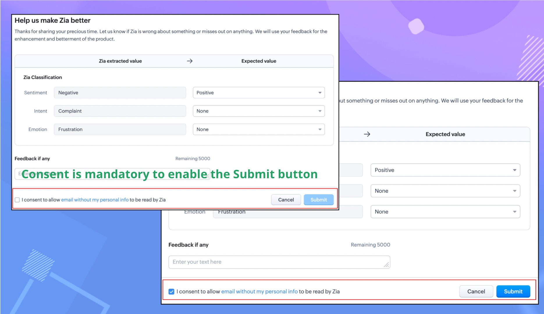 - 送信されたすべてのフィードバックは、担当者による確認後、Ziaの学習に使用されます。
