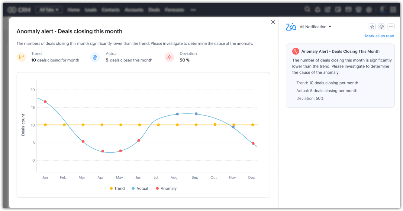 Zoho CRMのAI営業アシスタント:Ziaは、以下のような方法でビジネスの異常を特定するのに役立ちます: