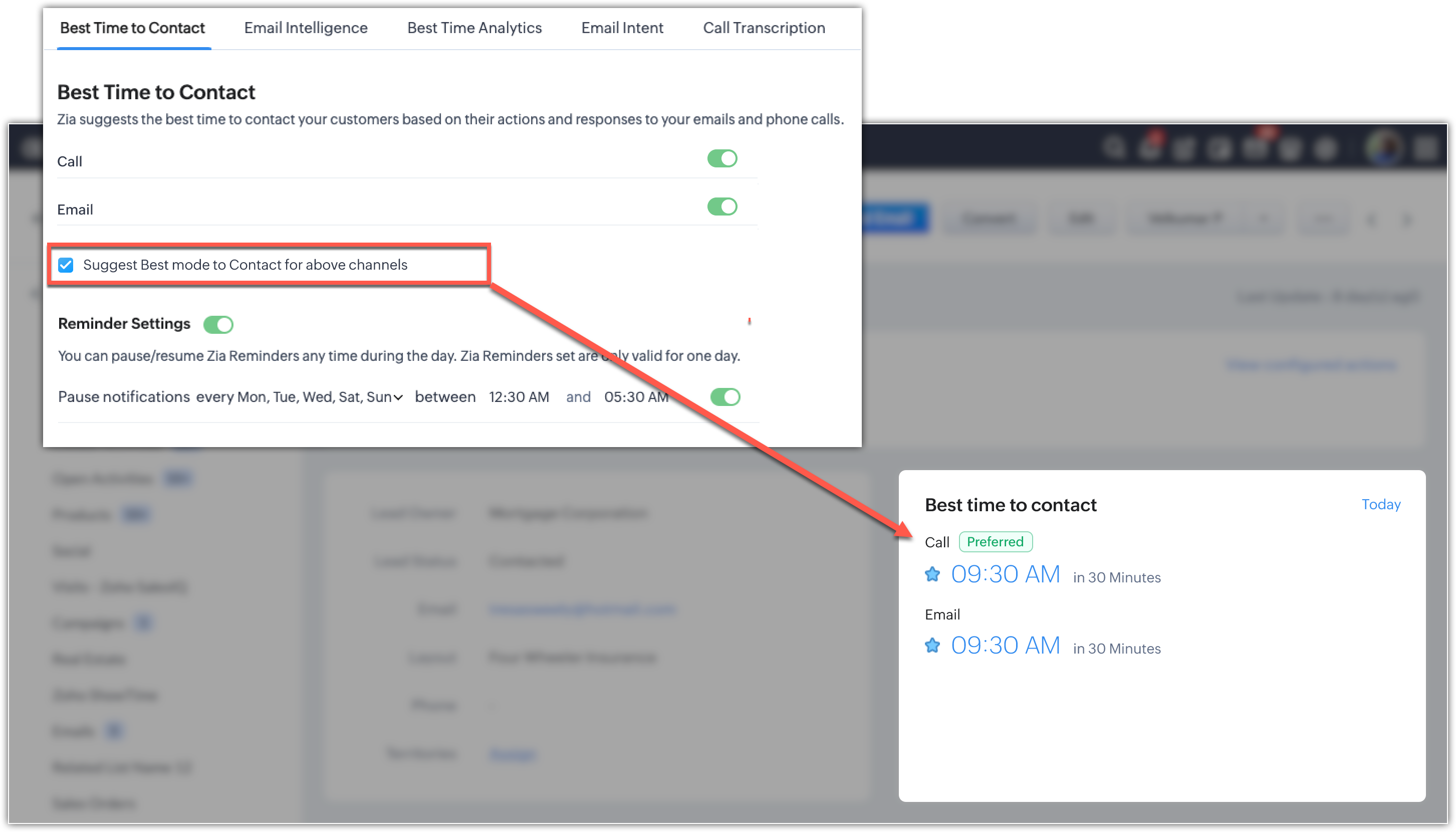 そこで、Ziaの既存の連絡に最適な時間帯機能に加え、最も効果的な連絡方法を提案するオプションを導入しました。この機能を有効にすると、「連絡に最適な時間帯」ウィジェットの中で、提案された連絡方法の横に「推奨」表記が表示されます。