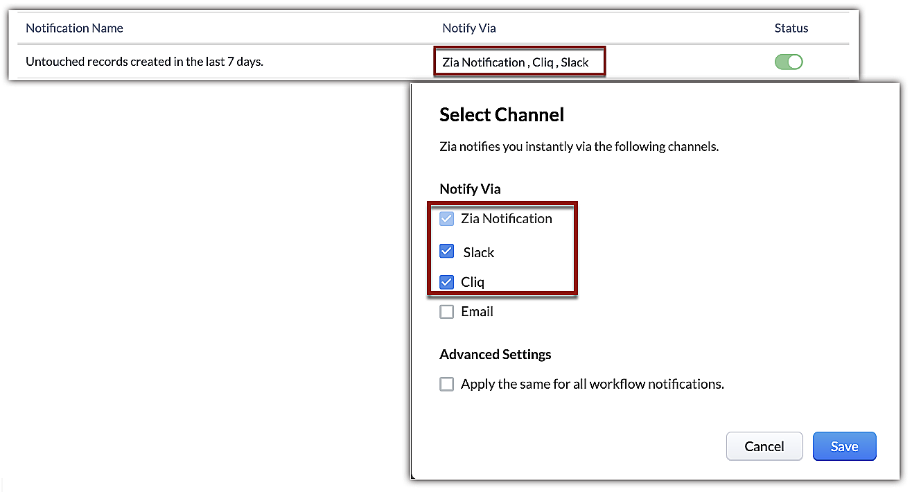 通知の種類ごとに、好みに応じてチャネルを選択することができます。例えば、営業担当者であれば、過去7日間に作成されたが未処理のデータについて最新情報を得たい場合、Zoho CliqやSlack経由で異常に関する通知を即時に受け取るように選択できます。
