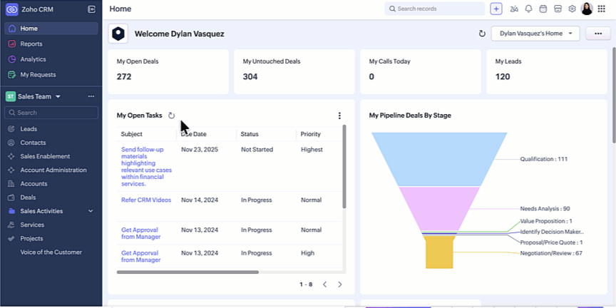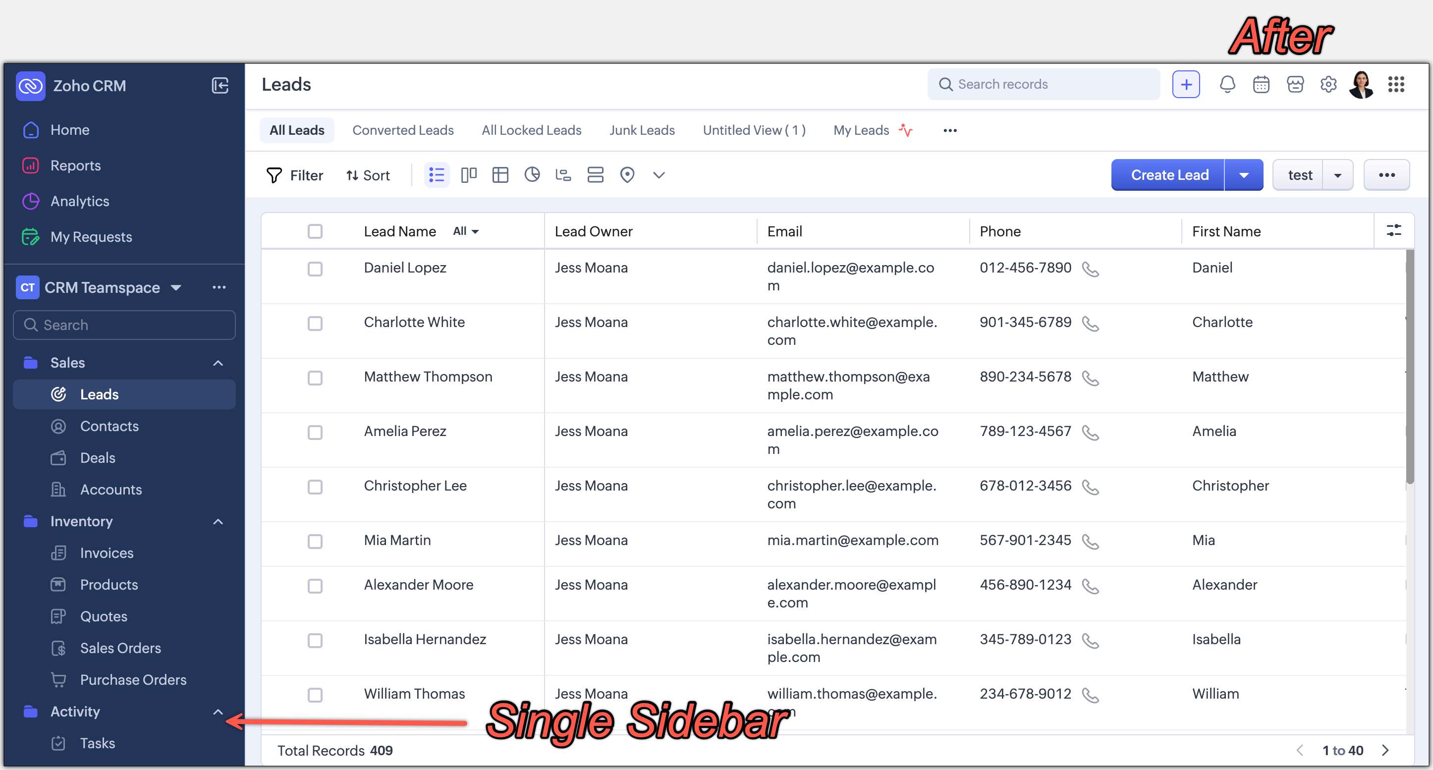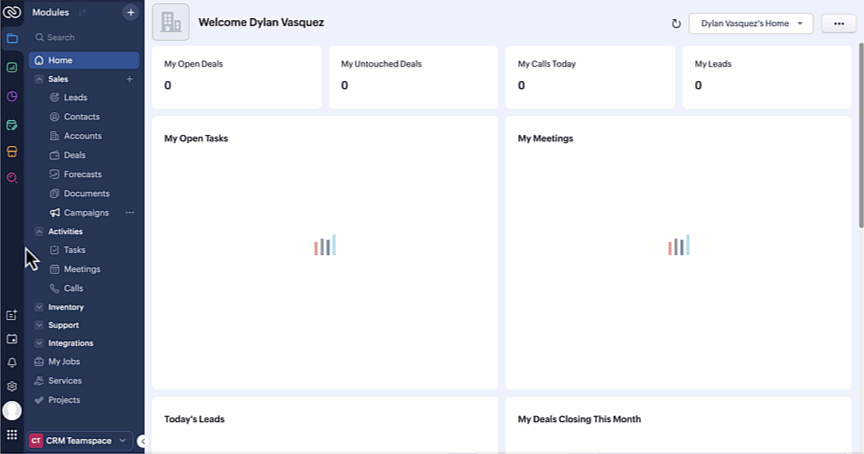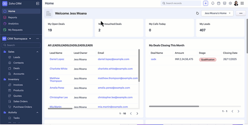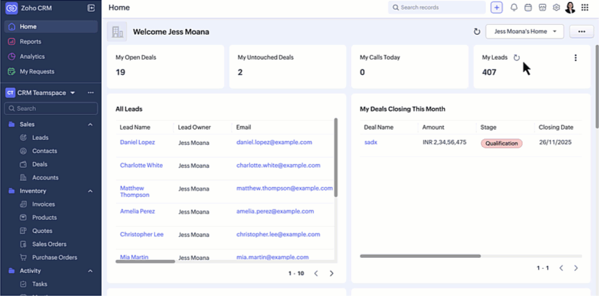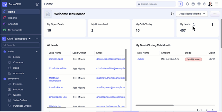 Zoho CRM for EveryoneのUIを改善しました。以下の変更は皆様からの貴重なフィードバックを反映したもので、使いやすさの向上、画面スペースの拡大、ナビゲーションの円滑化に重点を置き、必要な機能すべてにワンクリックでアクセスできるようになりました。