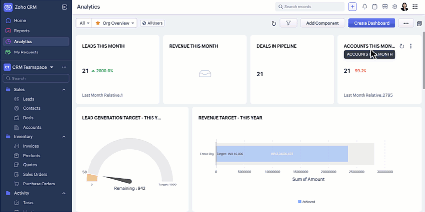 同じドロップダウンメニューから、作成したフォルダーやダッシュボードの管理、ZiaやZoho Analyticsの利用も行えます。レポートとダッシュボードのリストがどこに配置されるようになったかは、以下のGIFをご覧ください。