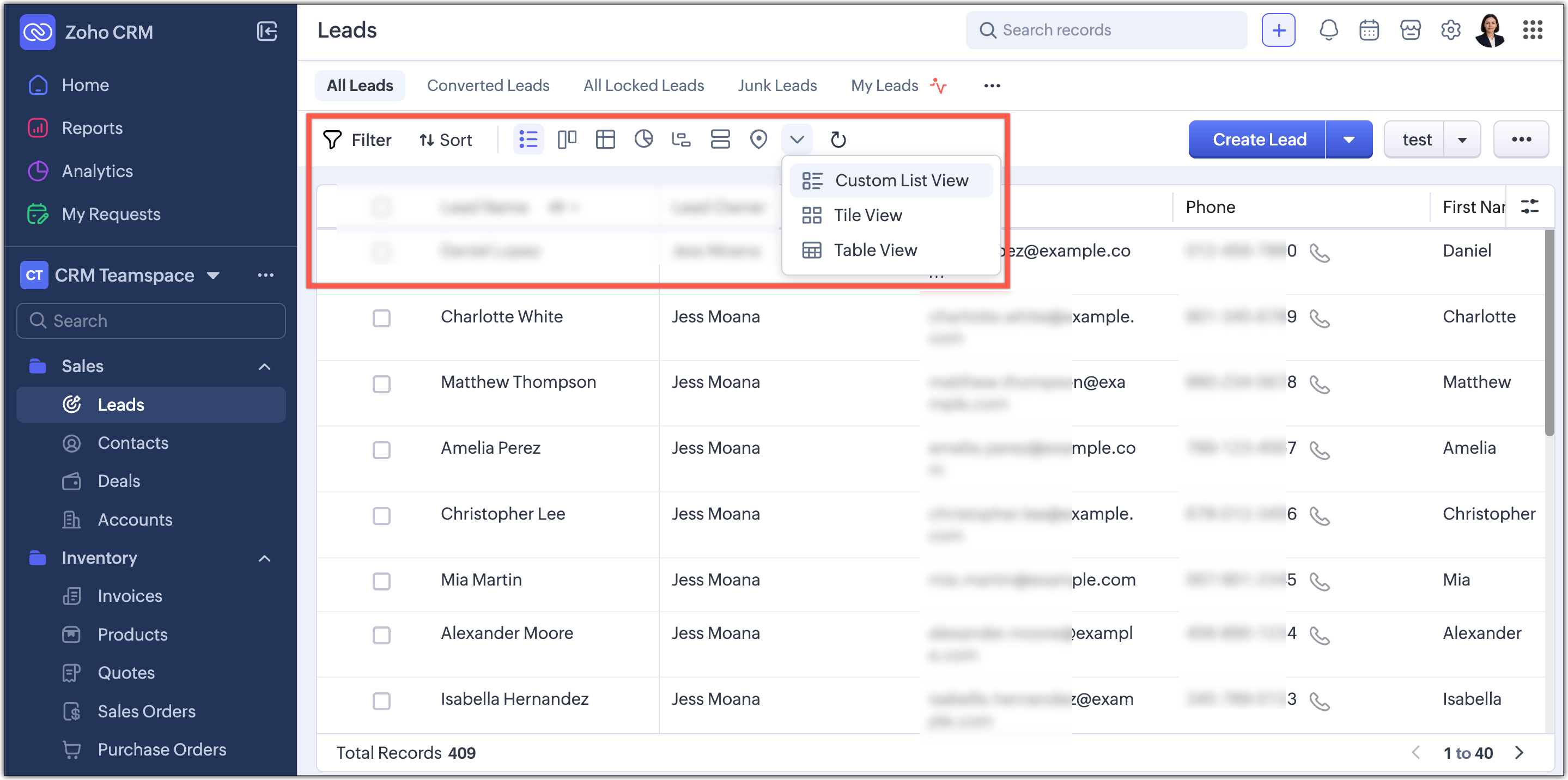 これまでのUIでは、フィルターオプションは上部のカスタムビューオプションの隣で個別に利用可能です。同様に、タブのデータ一覧オプションもデータ作成ボタンの隣に配置され、選択可能なドロップダウンとして展開されます。