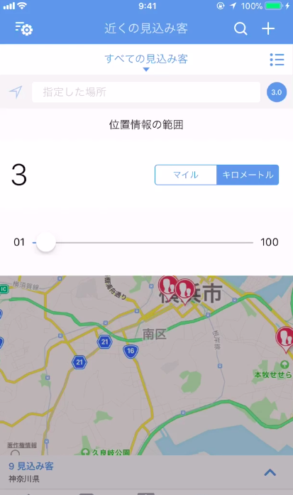 2)自分の現在地からどのくらい周辺の範囲の顧客情報を確認するかを選択できます。「位置情報の範囲」を設定してください。