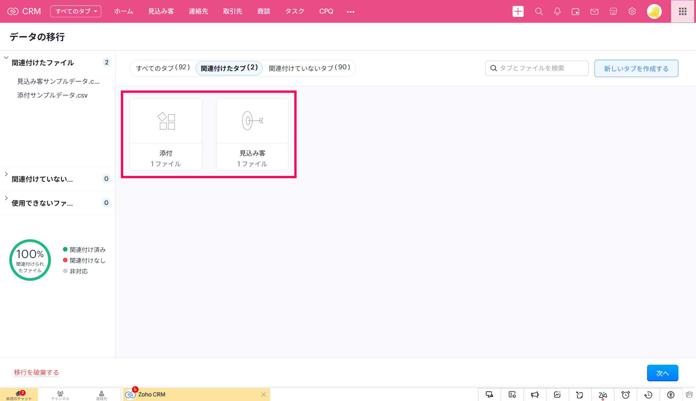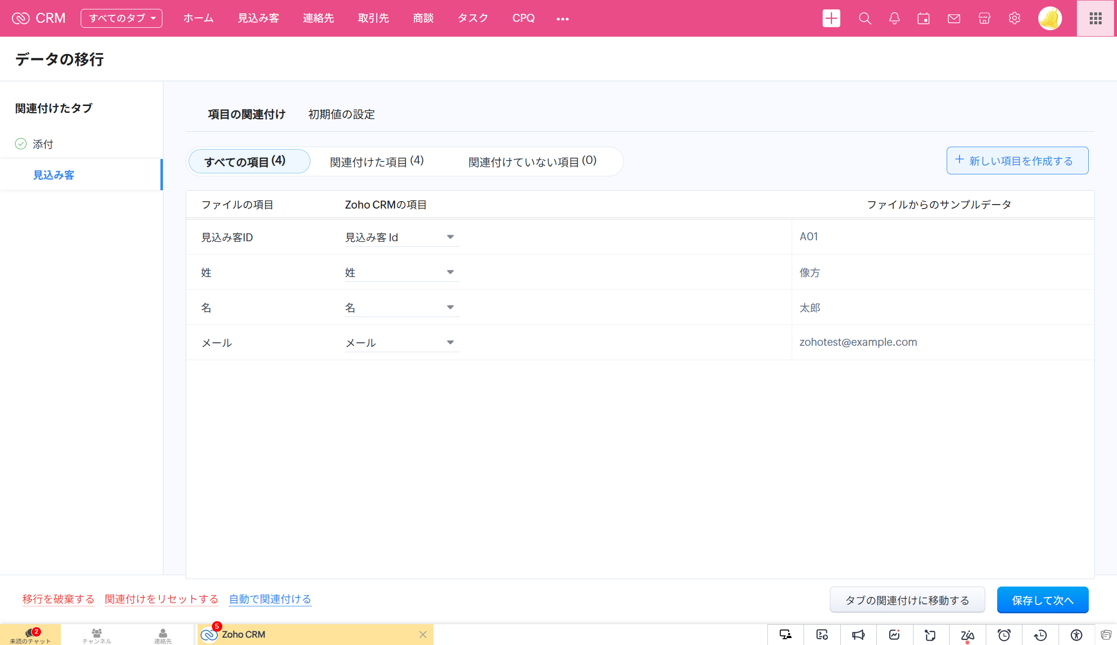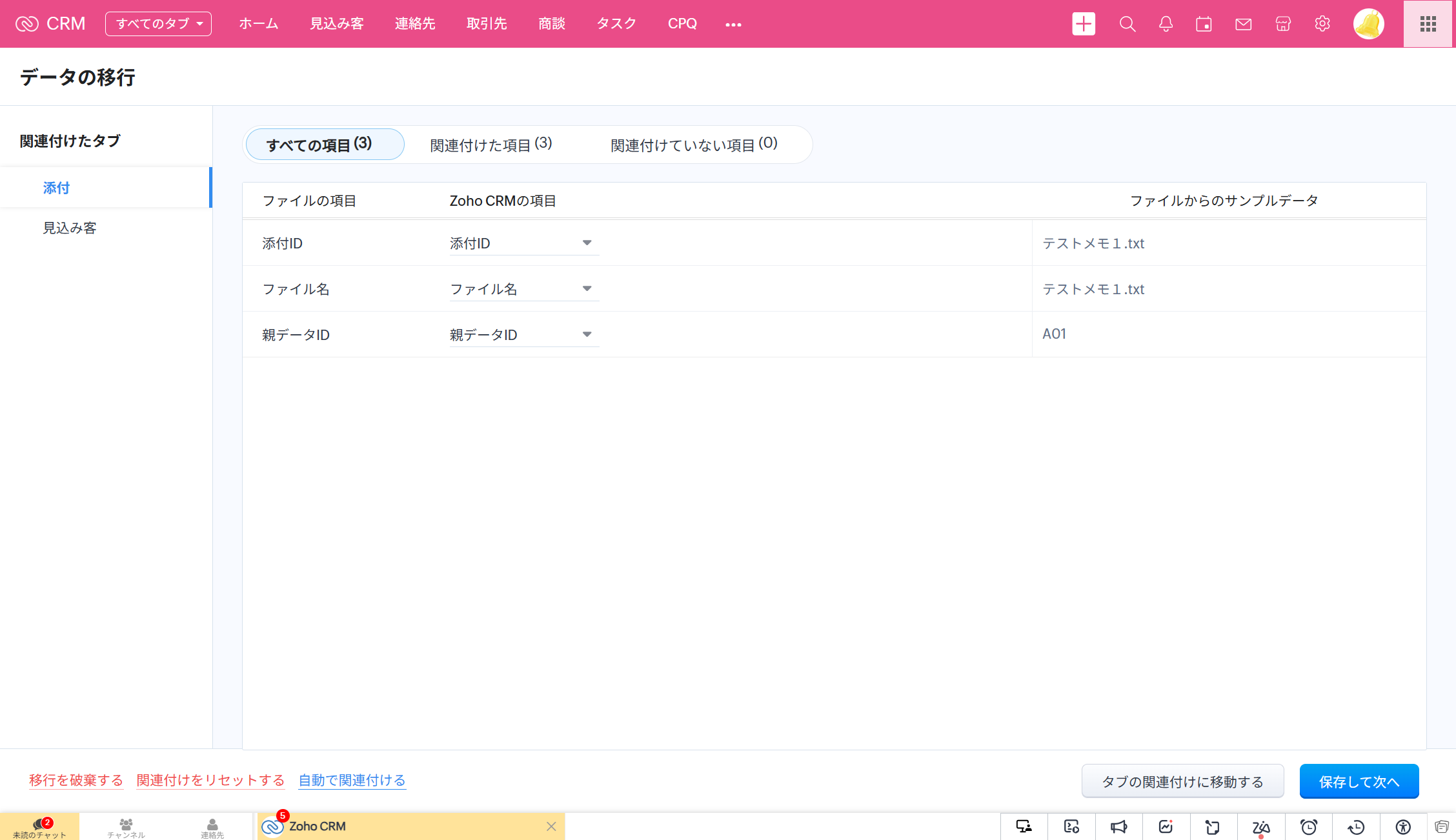 3.①と②のファイルを、それぞれ「見込み客」、「添付」に関連付けます。