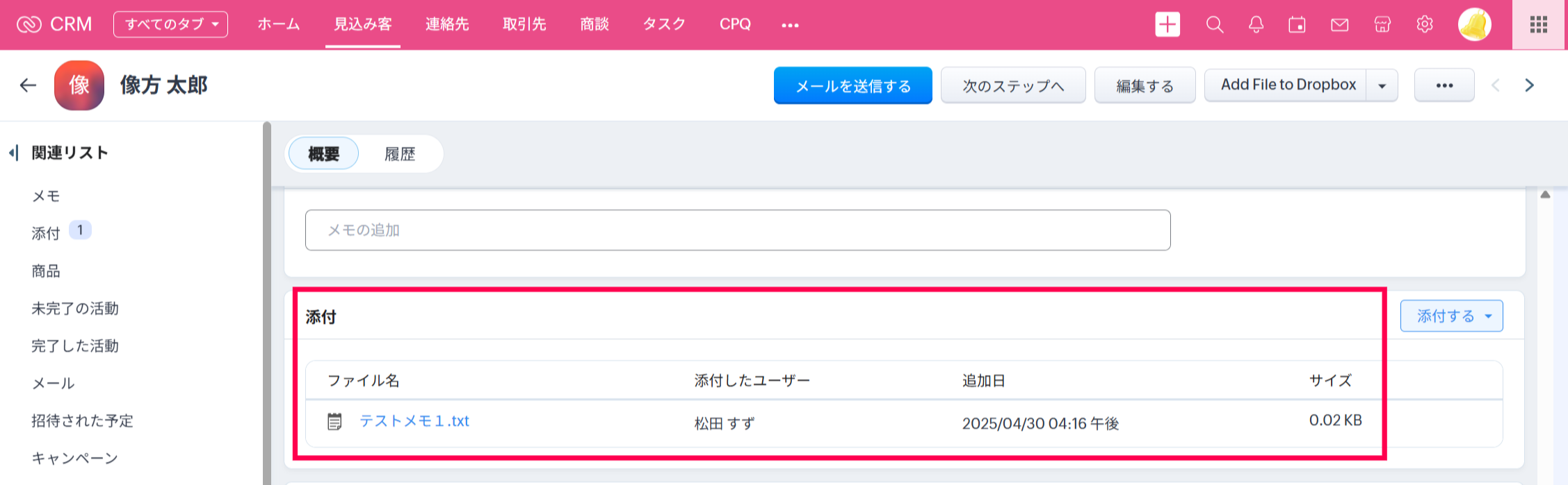 今回の例として、見込み客に添付ファイルを関連付けるインポート方法をご紹介いたします。