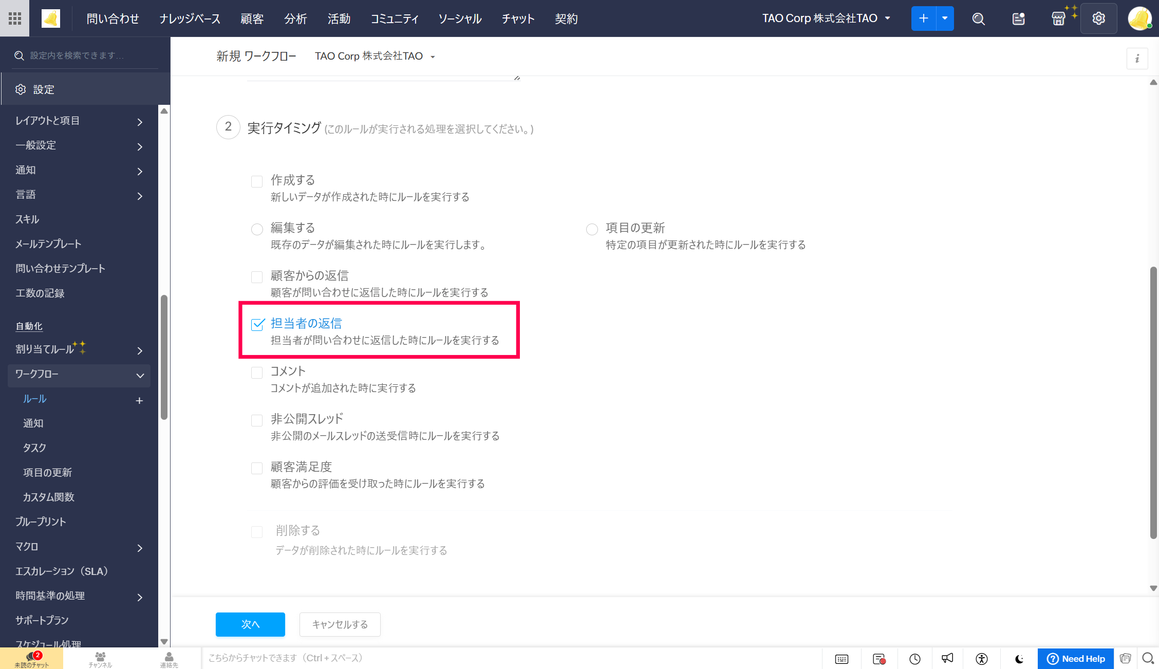 実行タイミングとして「担当者の返信」を設定し、処理として「通知」を設定し、3で作成した処理を選択