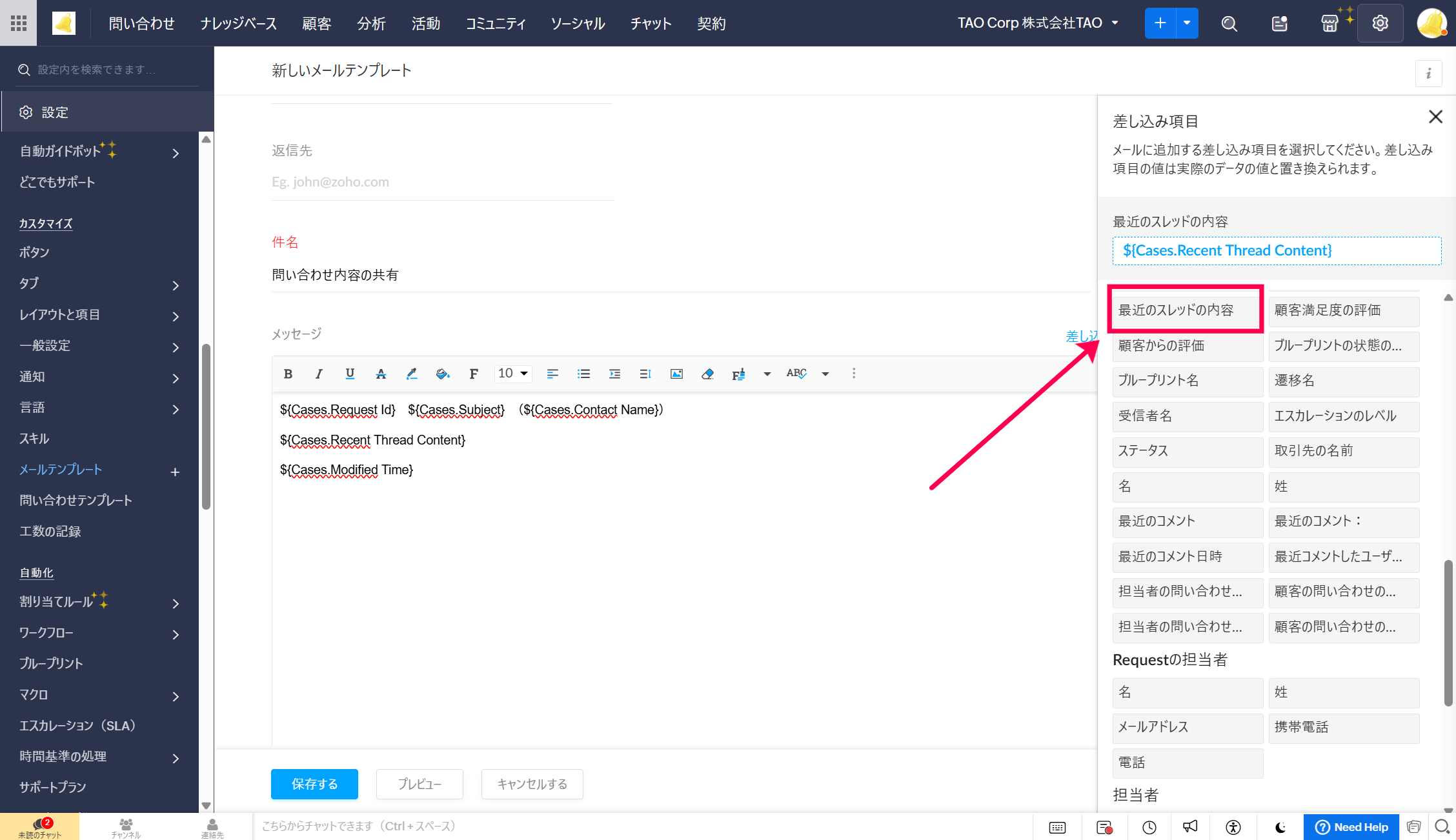 2. メールテンプレート作成画面にて、差し込み項目の「最近のスレッドの内容」を追加