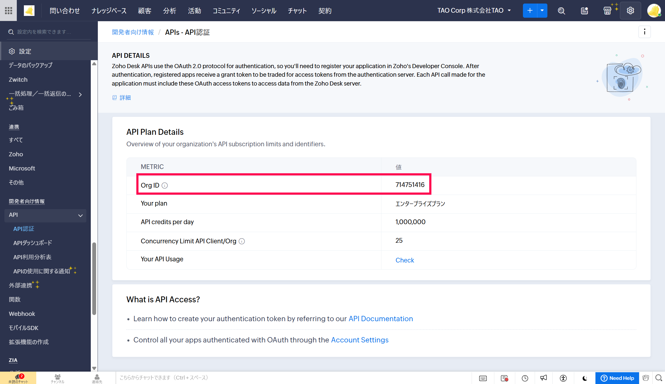 組織IDは、Zoho Deskの設定>開発者向け情報>API>API認証画面へと移動後、「org ID」値で確認いただけます。