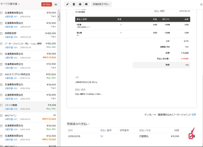 請求書詳細画面下部にある「受領済みの支払い」セクションの「編集」アイコンをクリックします。