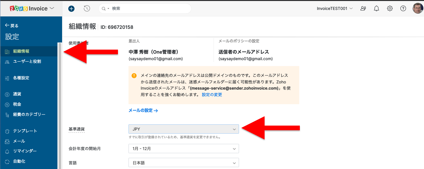 【Zoho Invoice】 基準通貨の設定(取引開始後変更不可)