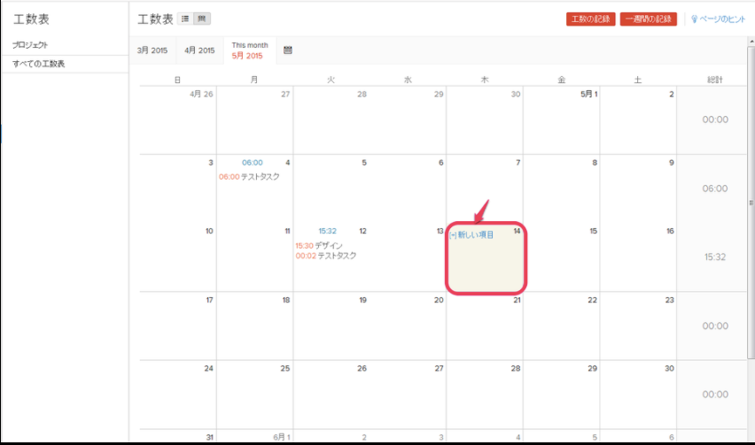 (日付にカーソルを合わせると「[+]新しい項目」リンクが表示されます)