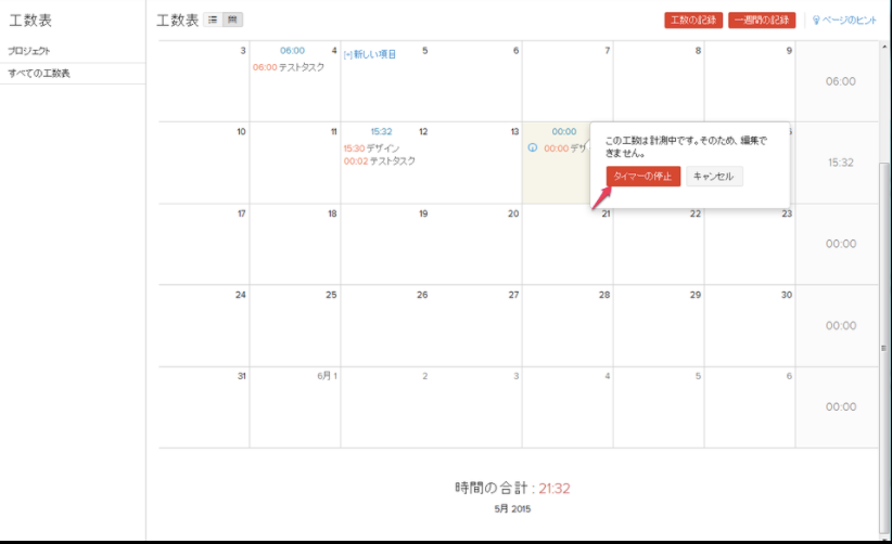 タスクにかかった時間がカレンダー画面に表示されます。