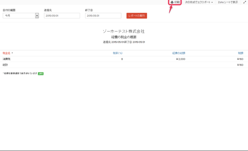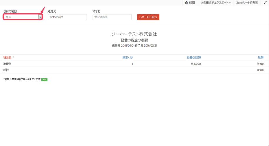 カテゴリー別の経費は、画面左のレポート>購入と経費>「カテゴリー別の経費の概要」へ移動しますと、確認可能です。 希望の「日付の範囲」や、必要に応じて「+その他のフィルター」(詳細フィルター)を設定し、「レポートの実行」ボタンをクリックします。 必要に応じて、レポートデータをエクスポートしたり、印刷することも可能です。