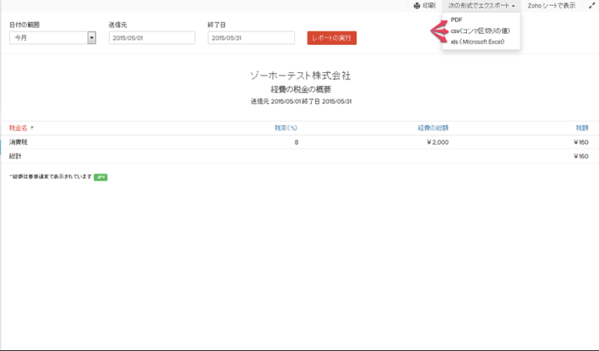 PDF, csv, xlsからエクスポート形式を選択してエクスポートします。
