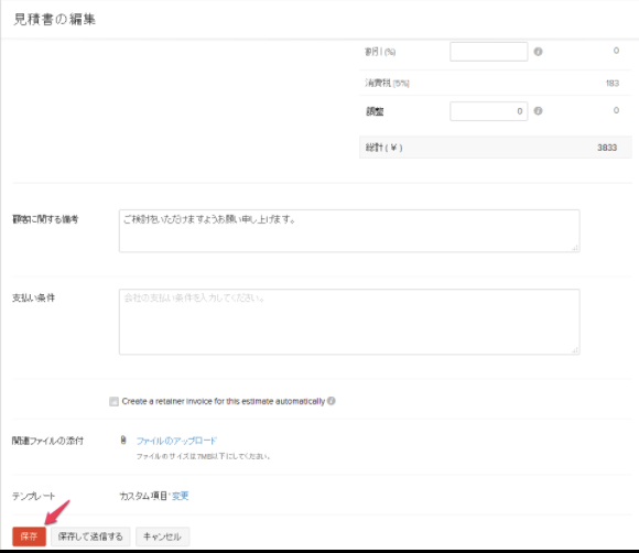 「見積書の編集」画面に戻りますので、必要に応じて編集してください。