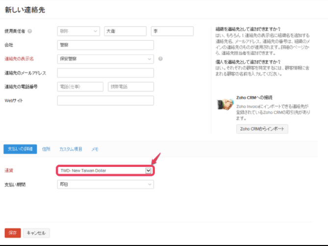 基準通貨とは別に登録する場合、ドロップダウンリストから選択します。